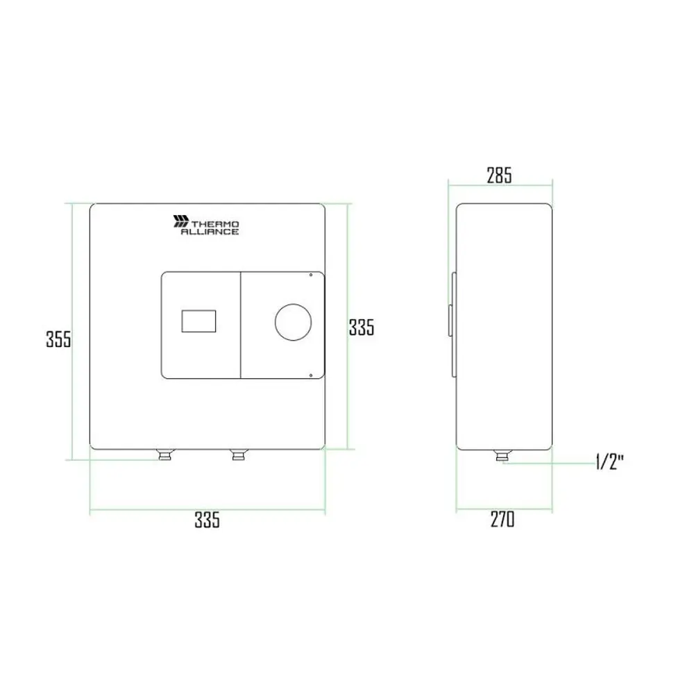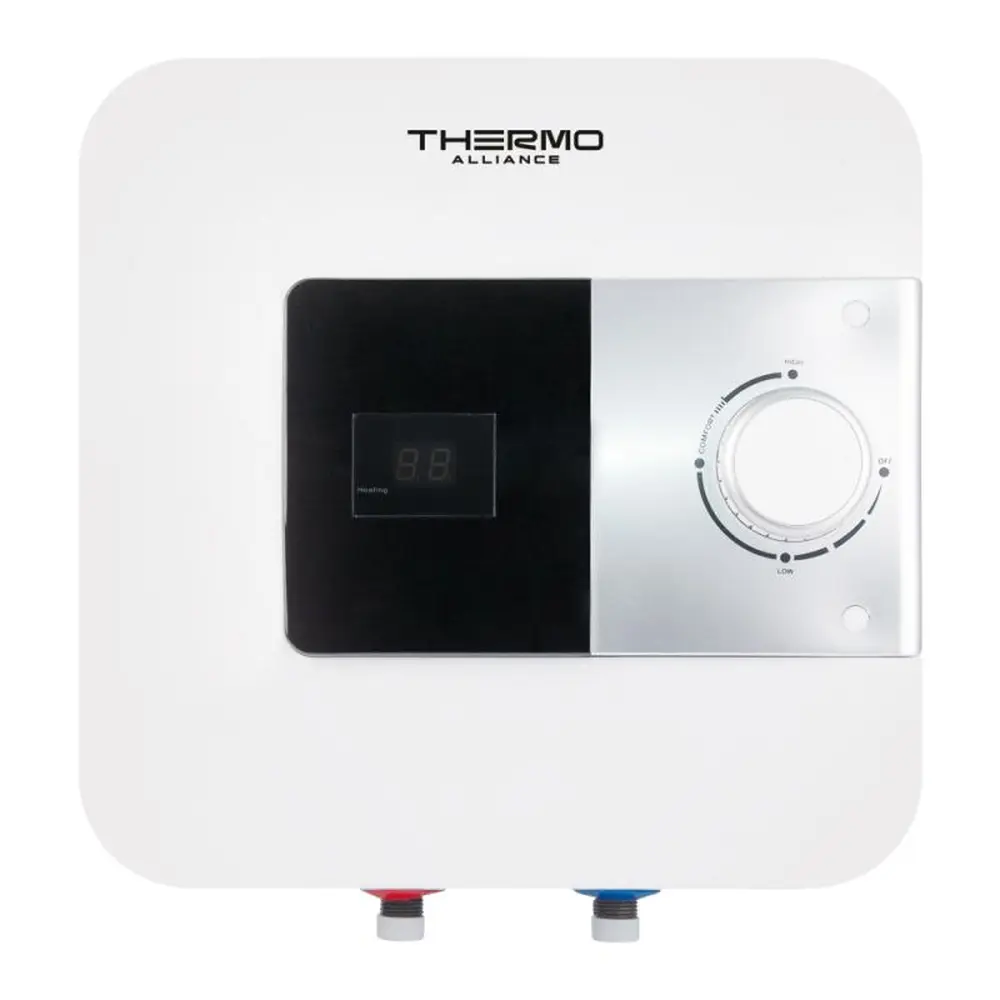 Водонагрівач Thermo Alliance 10 л над мийкою, мокрий ТЕН 1,5 кВт SF10X15N вирішує завдання забезпечення гарячою водою, в першу чергу для миття посуду. Всередині бак компактного водонагрівача вкритий шаром емалі, які захищає поверхню від корозії. Патрубки 1/2" для під’єднання до системи водопостачання розташовані знизу. На фронтальній поверхні корпусу — ручка управління та дисплей з індикацією температури нагріву. Товщина внутрішнього бака - 2 мм.