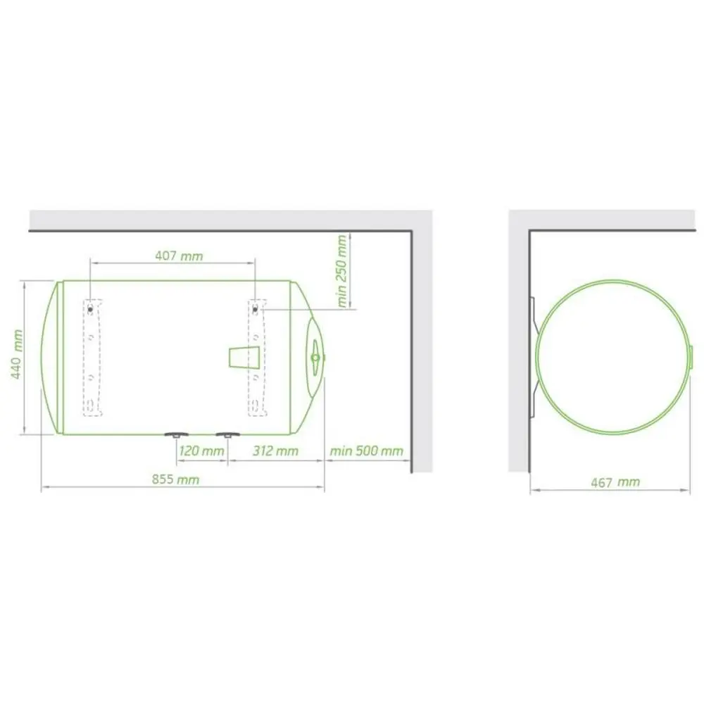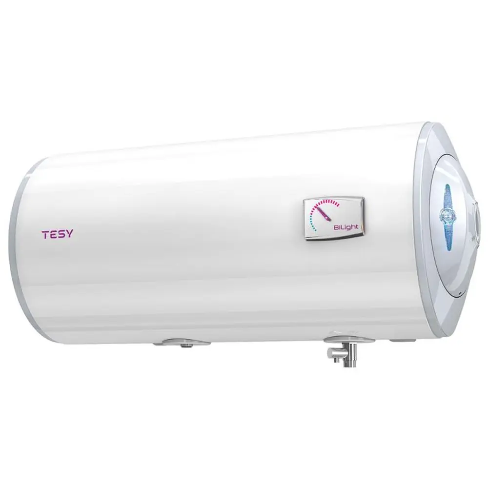 Для горизонтального настінного встановлення призначений водонагрівач Tesy Bilight 80 л, мокрий ТЕН 2,0 кВт (GCH804420B12TSR) 303315. Пристрій в глибину разом з елементами кріплення займає 46,7 см. Виходи підключення до системи водопостачання знаходяться внизу, ручка управління зі світловою індикацією BIlight — праворуч. Перемикання індикатора з червоного на синій колір сигналізує про те, що вода досягла потрібної температури. Захист резервуара з водою — шар склокераміки й магнієвий анод.