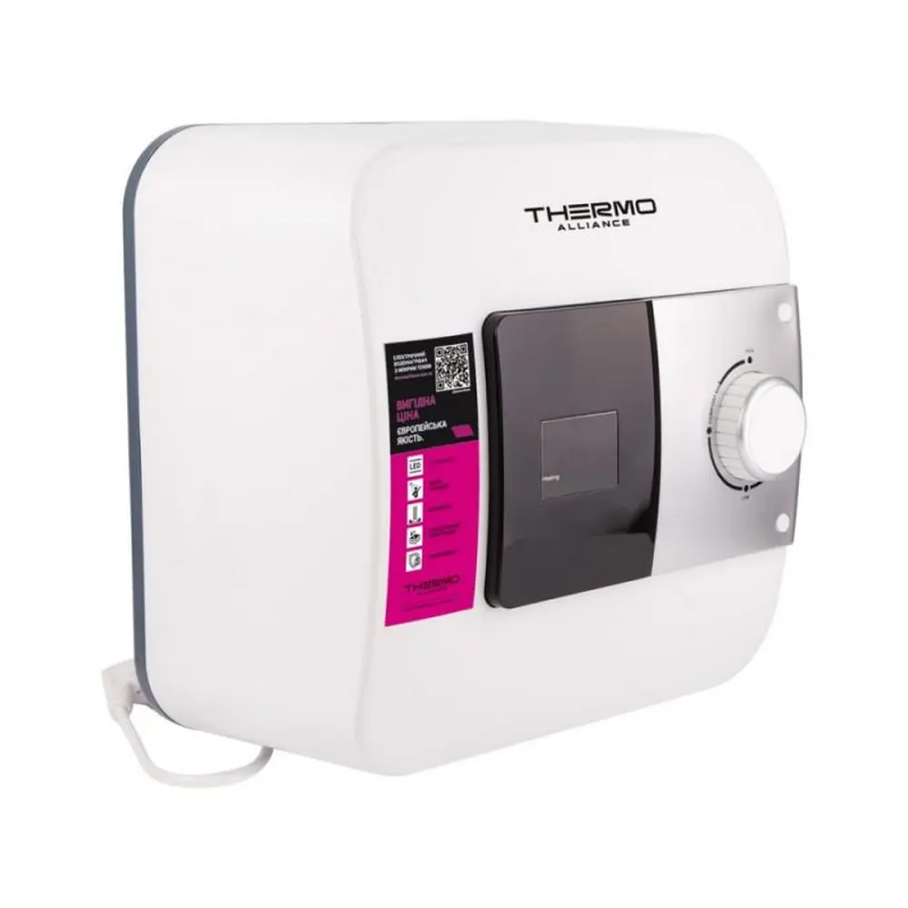 Водонагрівач Thermo Alliance 15 л над мийкою SF15X15N легко розмітити на будь-якій кухні та забезпечити подачу гарячої води для миття посуду, а також для інших господарсько-побутових потреб. Бак бойлера квадратної форми, його глибина разом з елементами кріплення становить 330 мм. Зсередини корпус захищений від корозії шаром емалевого покриття, магнієвим анодом. На передній поверхні розташована панель управління з поворотною ручкою регулювання нагріву й дисплеєм. Товщина внутрішнього бака - 2 мм.