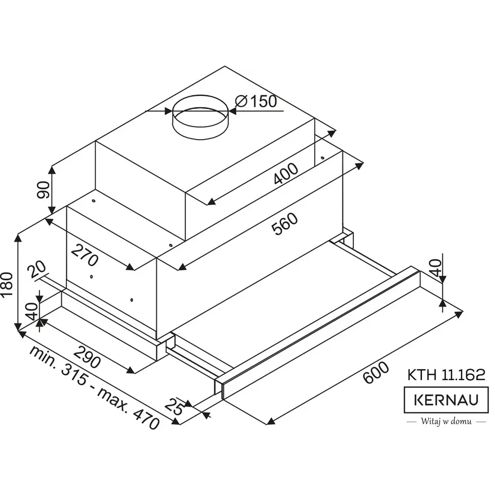 Телескопическая вытяжка Kernau установлена в кухонном шкафу. Характерным элементом ее конструкции является выдвижной ящик, выдвижение которого увеличивает поглощающую поверхность, активирует устройство и освещение, установленное в вытяжке. Прикладное сенсорное управление позволяет легко и точно выбирать программы вытяжки. Может работать как поглотитель или как вытяжка. Существующее светодиодное освещение отличается очень низким потреблением энергии, что помогает нам экономить и в то же время заботиться об окружающей среде. Если вы цените экономию, простоту использования и безопасность, то прибор Kernau создан именно для вас. Телескопическая вытяжка Kernau - это современная технология, функциональность и эстетичный вид.