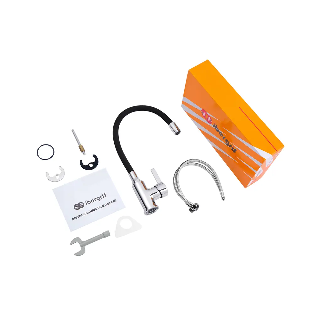 Смеситель для кухни Ibergrif M22112-2 с рефлекторным изливом станет находкой для тех, кого не устраивают стандартные решения с поворотным гусаком. Купив кран, вы сможете направить поток воды в нужном направлении. При этом не придется держать излив в руках: он сохраняет заданную форму благодаря специфической внутренней конструкции. Корпус выполнен из латуни, что позволяет выдерживать перепады температуры. Хромированное покрытие защищает основной материал от коррозии и повреждений, тем самым придает элегантности внешнему виду смесителя. Излив имеет силиконовое черное покрытие. Запорный элемент - керамический картридж диаметром 35 мм. Подключается к трубопроводу двумя гибкими подводками, которые идут в комплекте вместе с крепежным элементом, аэратором и резиновыми прокладками.