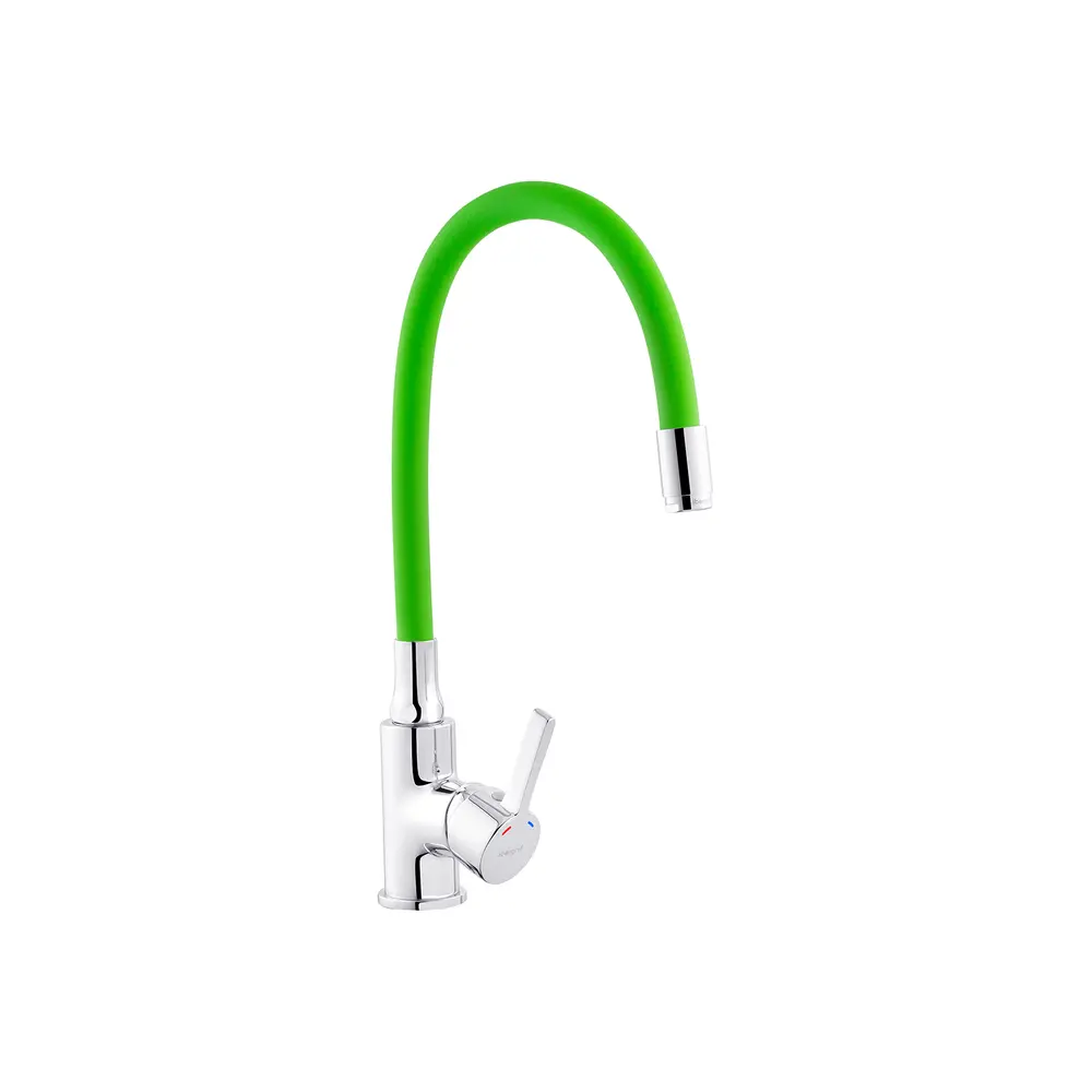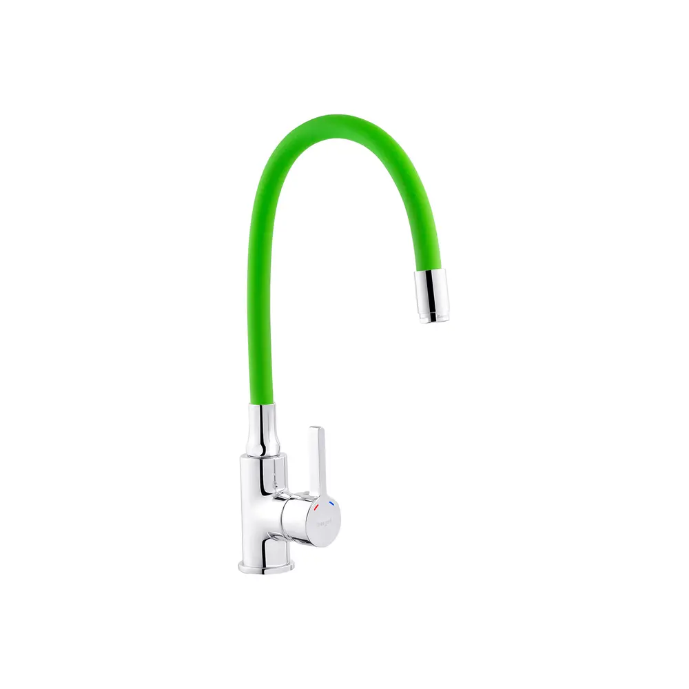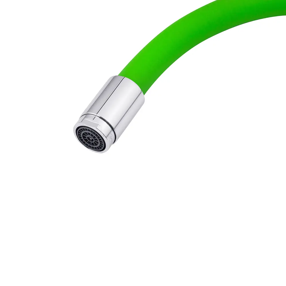 Смеситель для кухни Ibergrif M22112-5 с рефлекторным изливом станет находкой для тех, кого не устраивают стандартные решения с поворотным гусаком. Купив кран, вы сможете направить поток воды в нужном направлении. При этом не придется держать излив в руках: он сохраняет заданную форму благодаря специфической внутренней конструкции. Корпус выполнен из латуни, что позволяет выдерживать перепады температуры. Хромированное покрытие защищает основной материал от коррозии и повреждений, тем самым придает элегантности внешнему виду смесителя. Излив имеет силиконовое зеленое покрытие. Запорный элемент - керамический картридж диаметром 35 мм. Подключается к трубопроводу двумя гибкими подводками, которые идут в комплекте вместе с крепежным элементом, аэратором и резиновыми прокладками.