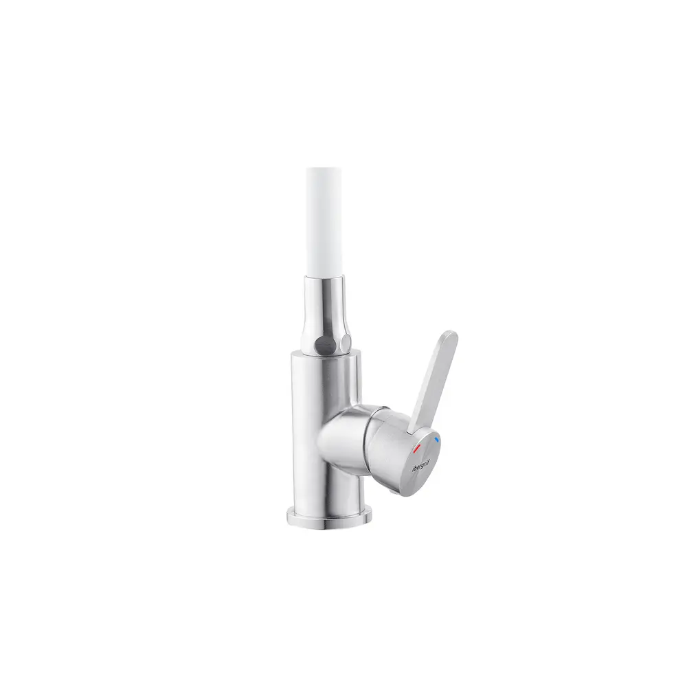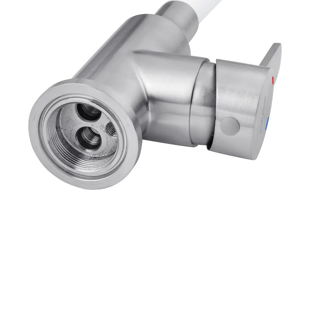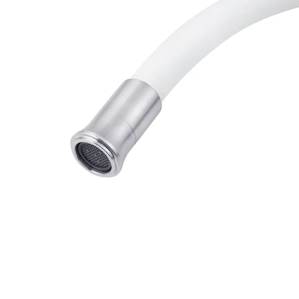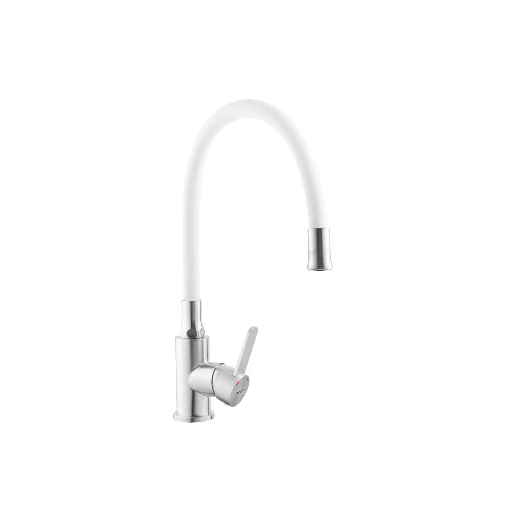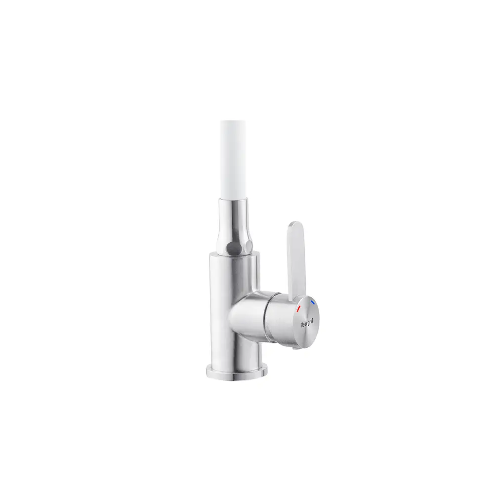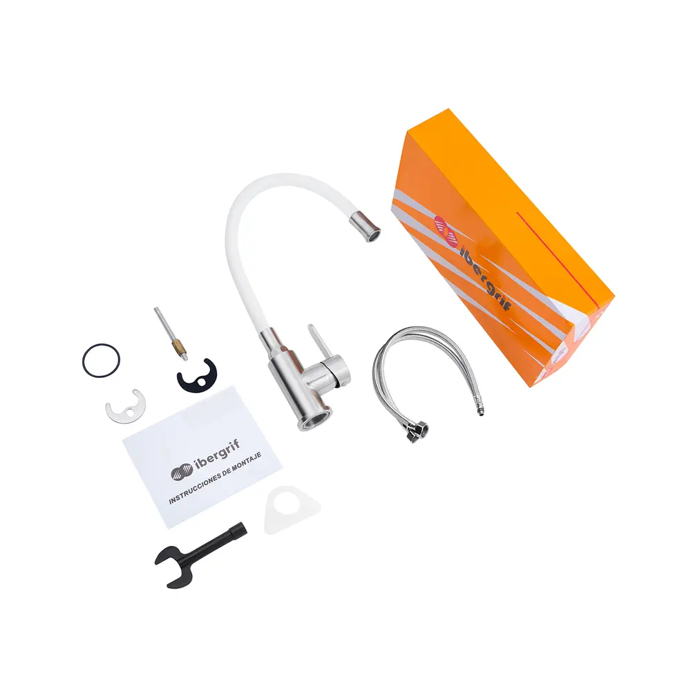 Смеситель для кухни Ibergrif M22119-3 с рефлекторным изливом станет находкой для тех, кого не устраивают стандартные решения с поворотным гусаком. Купив кран, вы сможете направить поток воды в нужном направлении. При этом не придется держать излив в руках: он сохраняет заданную форму благодаря специфической внутренней конструкции. Корпус выполнен из нержавеющей стали, что позволяет выдерживать перепады температуры. Хромированное покрытие защищает основной материал от коррозии и повреждений, тем самым придает элегантности внешнему виду смесителя. Излив имеет силиконовое белое покрытие. Запорный элемент - керамический картридж диаметром 35 мм. Подключается к трубопроводу двумя гибкими подводками, которые идут в комплекте вместе с крепежным элементом, аэратором и резиновыми прокладками.