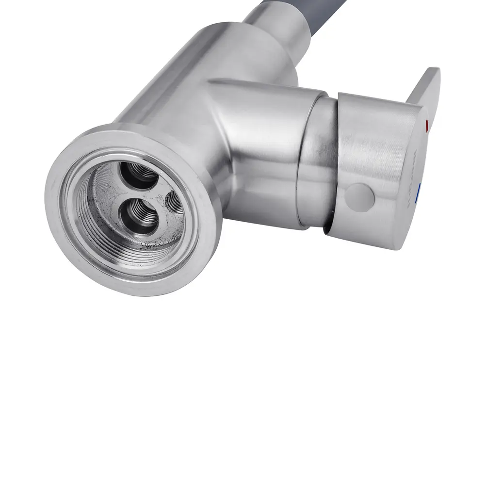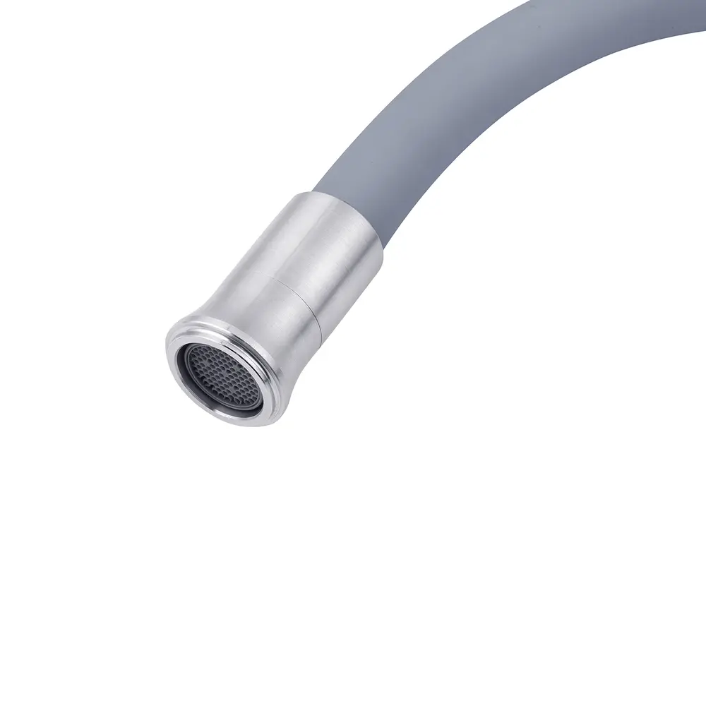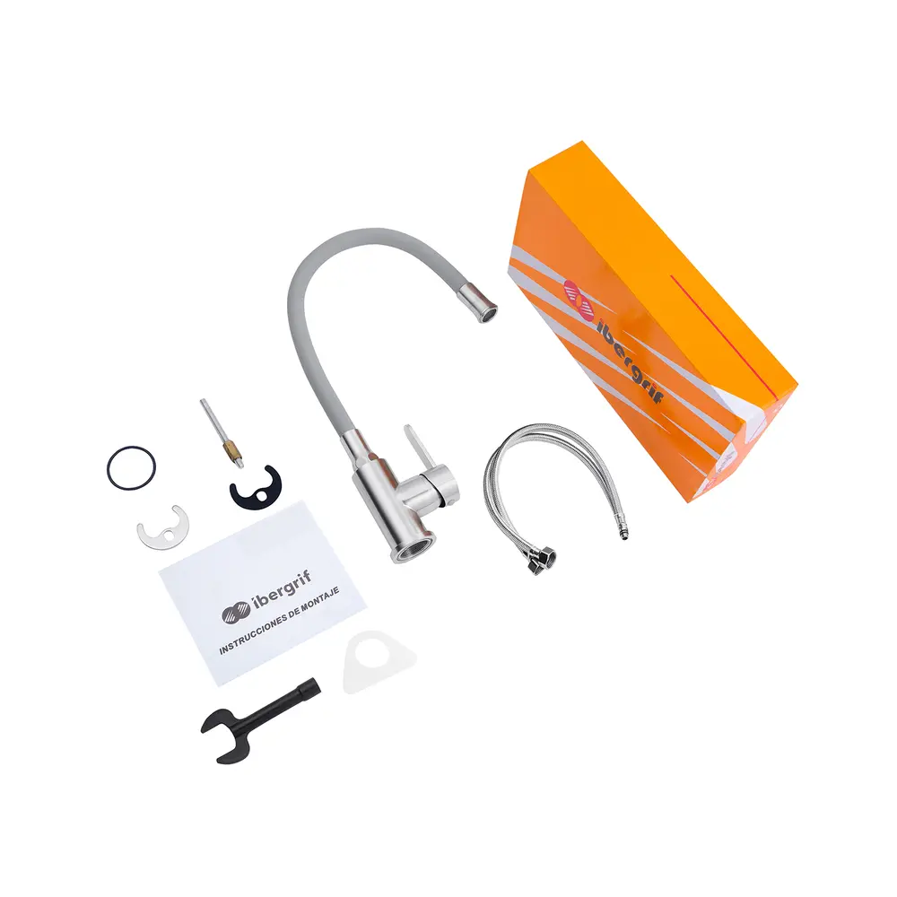 Смеситель для кухни Ibergrif M22119-9 с рефлекторным изливом станет находкой для тех, кого не устраивают стандартные решения с поворотным гусаком. Купив кран, вы сможете направить поток воды в нужном направлении. При этом не придется держать излив в руках: он сохраняет заданную форму благодаря специфической внутренней конструкции. Корпус выполнен из нержавеющей стали, что позволяет выдерживать перепады температуры. Хромированное покрытие защищает основной материал от коррозии и повреждений, тем самым придает элегантности внешнему виду смесителя. Излив имеет силиконовое серое покрытие. Запорный элемент - керамический картридж диаметром 35 мм. Подключается к трубопроводу двумя гибкими подводками, которые идут в комплекте вместе с крепежным элементом, аэратором и резиновыми прокладками.