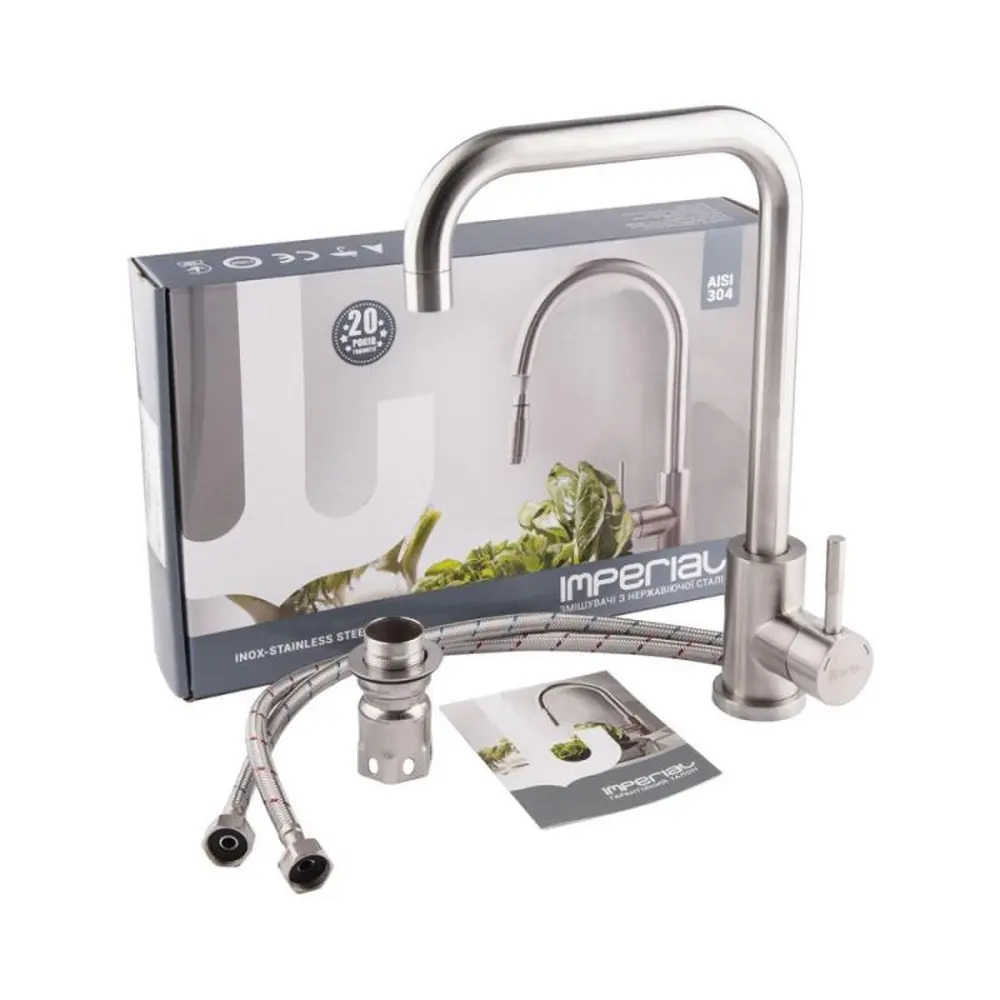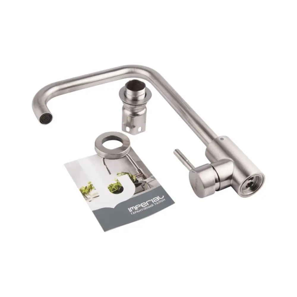 Змішувач для кухні Imperial 31-107-02 виготовлений з нержавіючої сталі. Завдяки нікельованій брашованій поверхні має оригінальний зовнішній вигляд. Виконаний в сучасному стриманому стилі. Такий змішувач не тільки зручний та практичний, а й ідеально доповнить інтер‘єр кухні. Після виточування вироби не проходять додаткове шліфування, незначні подряпини вважаються нормою і не є браком.