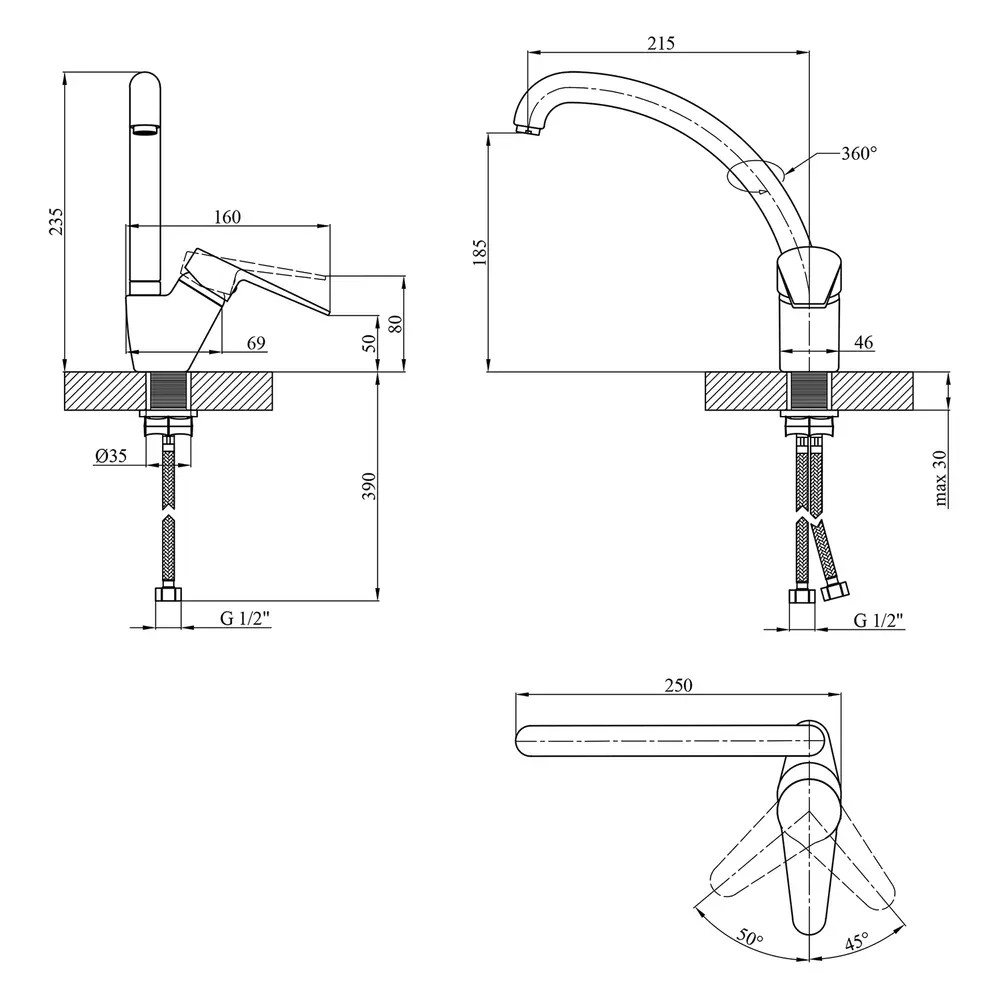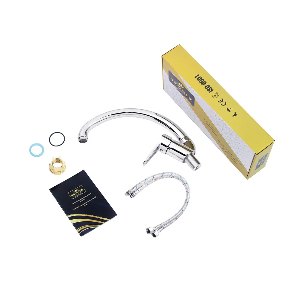 Кухонные смесители от KRONER – это немецкое качество, технология и надежность. Современный дизайн станет удачным дополнением интерьера кухни. Изготовление из качественных материалов, не поддающихся коррозии, легкость в сборке не доставит хлопот при монтаже и использовании. Имеют поворотное излияние и устанавливается на одно отверстие с подводом воды с помощью гибких шлангов М10х1/2". Шланги для подключения входят в комплект. Данная модель изготовлена из силумина.