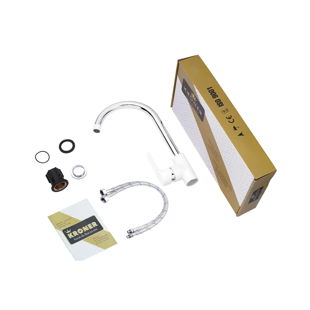 Кухонные смесители от KRONER – это немецкое качество, технология и надежность. Современный дизайн станет удачным дополнением интерьера кухни. Изготовление из качественных материалов, не поддающихся коррозии, легкость в сборке не доставит хлопот при монтаже и использовании. Имеют поворотное излияние и устанавливается на одно отверстие с подводом воды с помощью гибких шлангов М10х1/2". Шланги для подключения входят в комплект. Данная модель изготовлена из силумина.