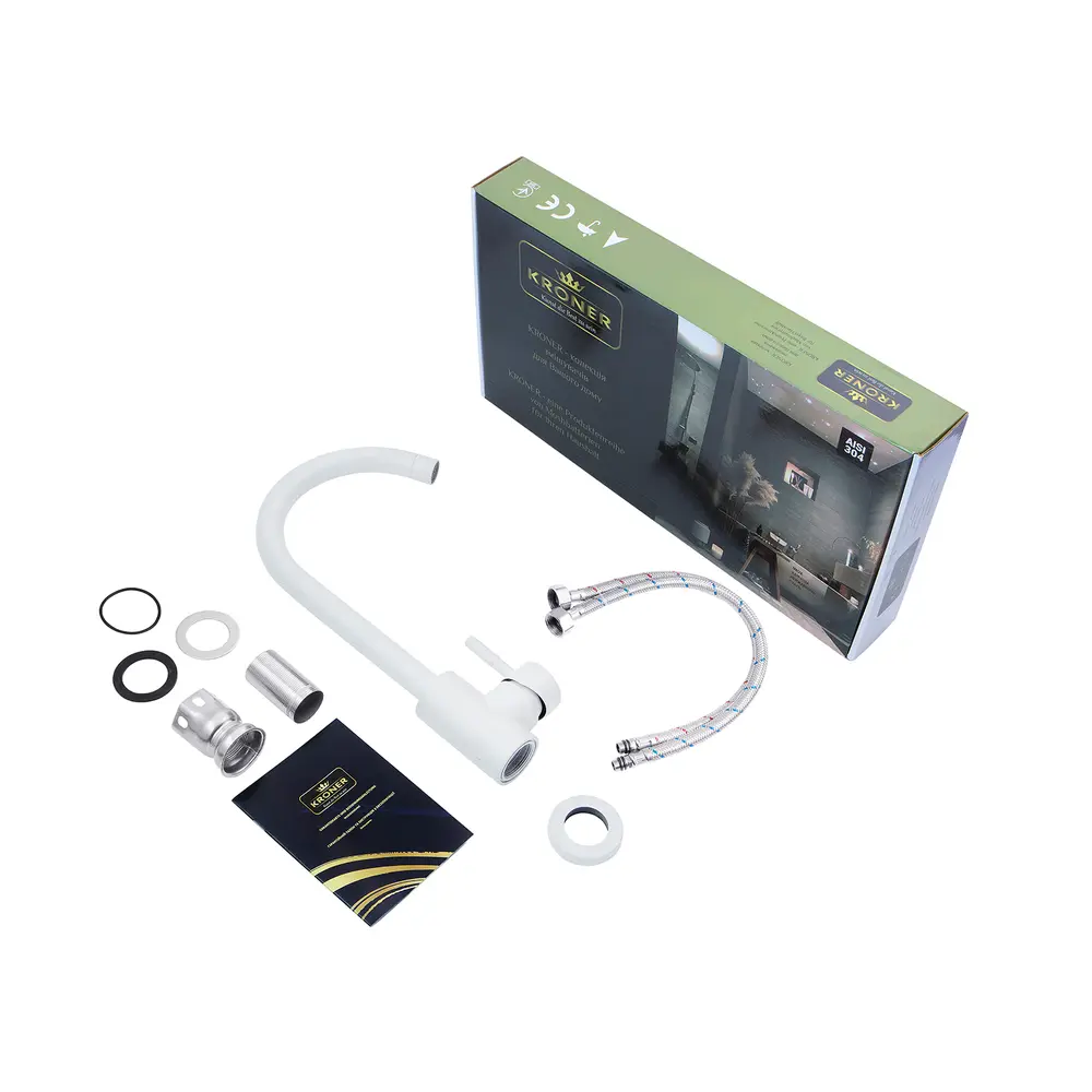 Кухонные смесители от KRONER – это немецкое качество, технология и надежность. Современный дизайн станет удачным дополнением интерьера кухни. Изготовление из качественных материалов, не поддающихся коррозии, легкость в сборке не доставит хлопот при монтаже и использовании. Имеют поворотное излияние и устанавливается на одно отверстие с подводом воды с помощью гибких шлангов М10х1/2". Шланги для подключения входят в комплект. Данная модель изготовлена из нержавеющей стали AISI 304.