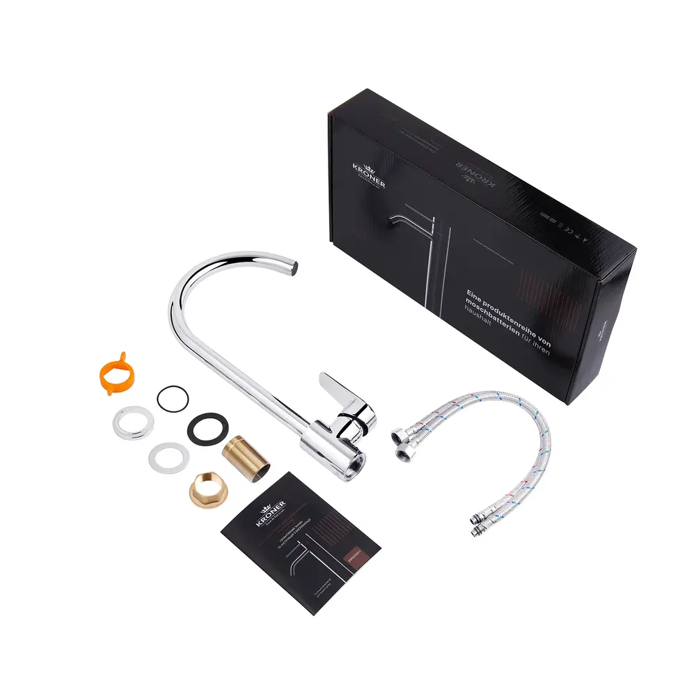 Кухонные смесители от KRONER – это немецкое качество, технология и надежность. Современный дизайн станет удачным дополнением интерьера кухни. Изготовление из качественных материалов, не поддающихся коррозии, легкость в сборке не доставит хлопот при монтаже и использовании. Имеют поворотное излияние и устанавливается на одно отверстие с подводом воды с помощью гибких шлангов М10х1/2". Шланги для подключения входят в комплект. Данная модель изготовлена из латуни.