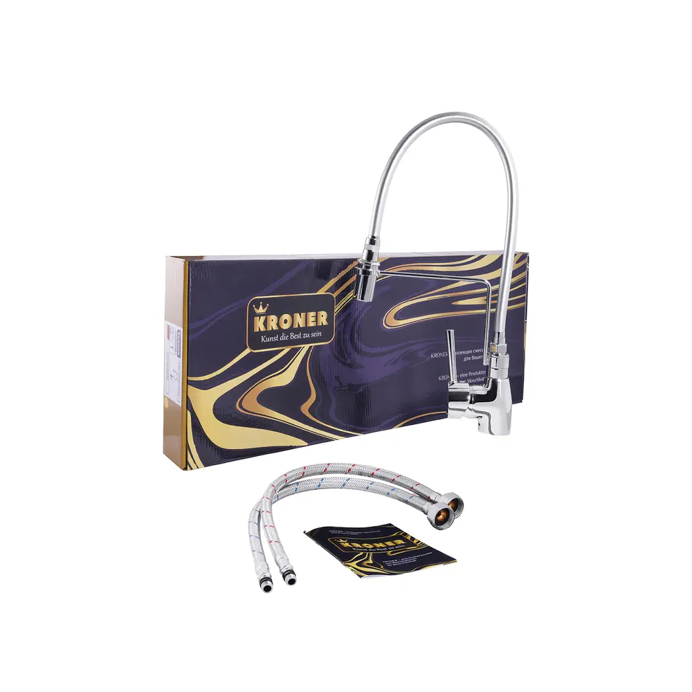 Кухонные смесители от KRONER – это немецкое качество, технология и надежность. Современный дизайн станет удачным дополнением интерьера кухни. Изготовление из качественных материалов, не поддающихся коррозии, легкость в сборке не доставит хлопот при монтаже и использовании. Имеют поворотное излияние и устанавливается на одно отверстие с подводом воды с помощью гибких шлангов М10х1/2". Шланги для подключения входят в комплект. Данная модель изготовлена из латуни.