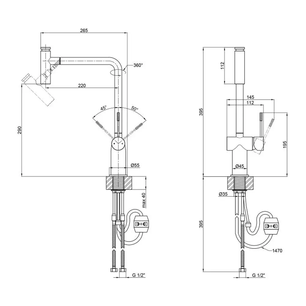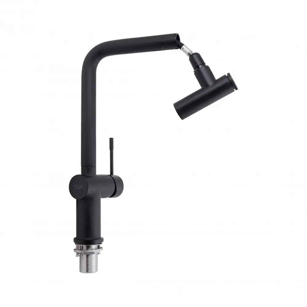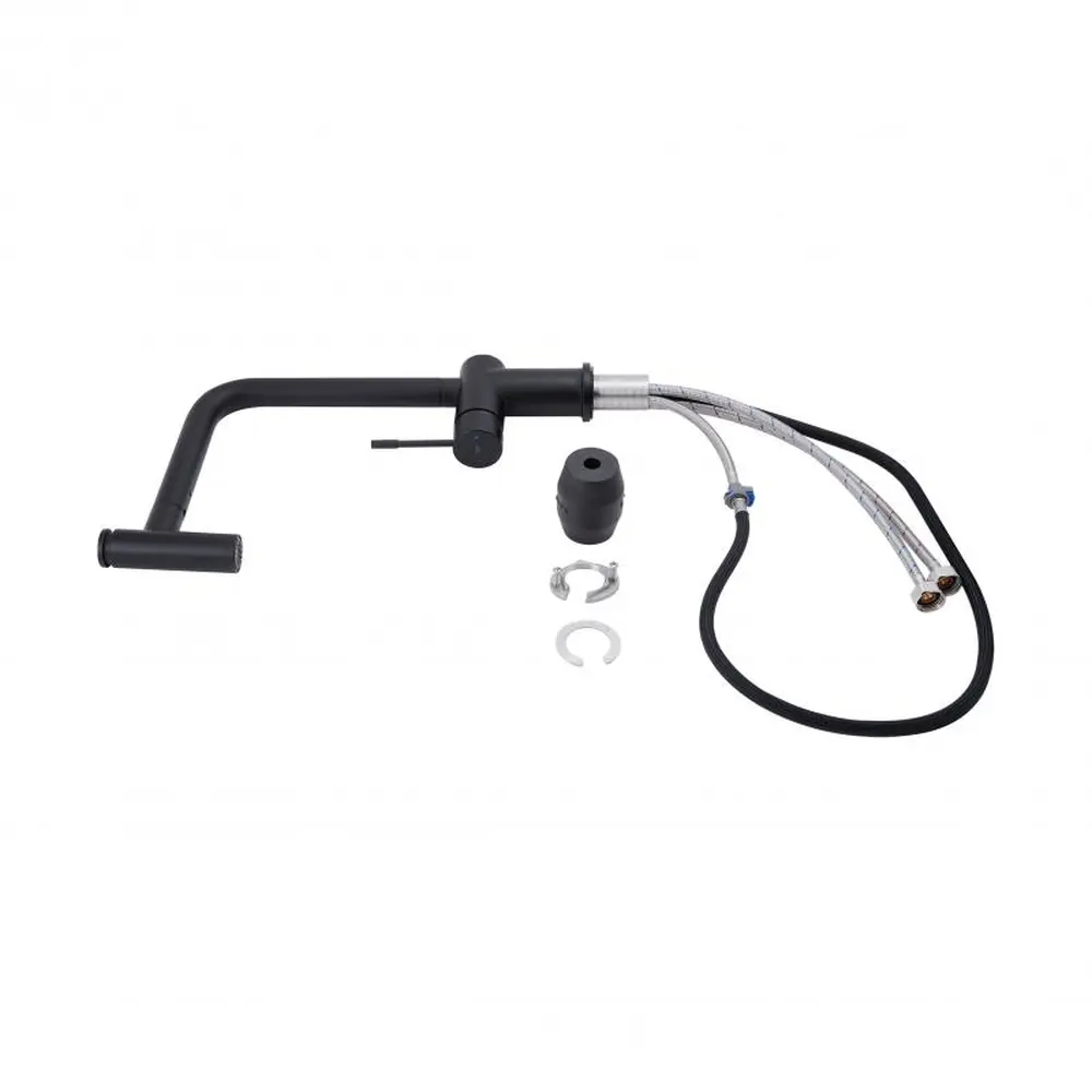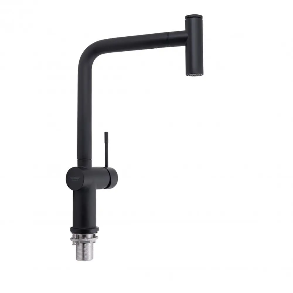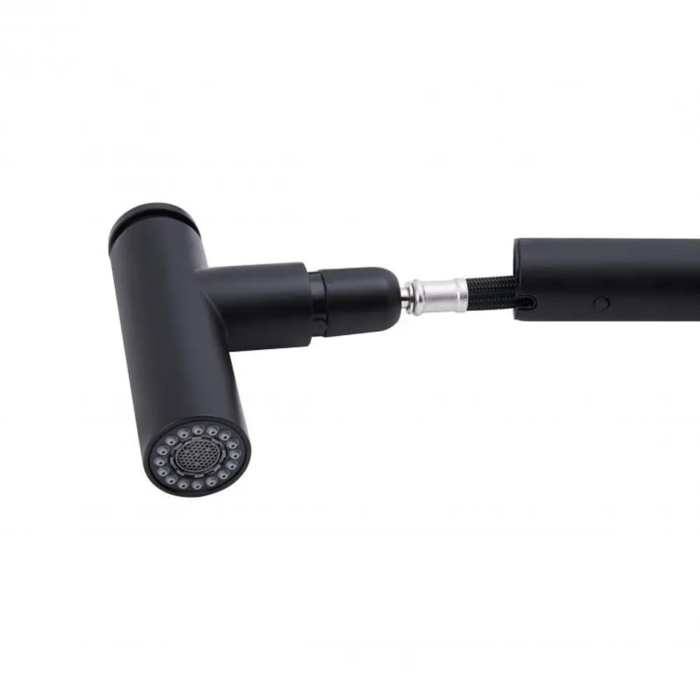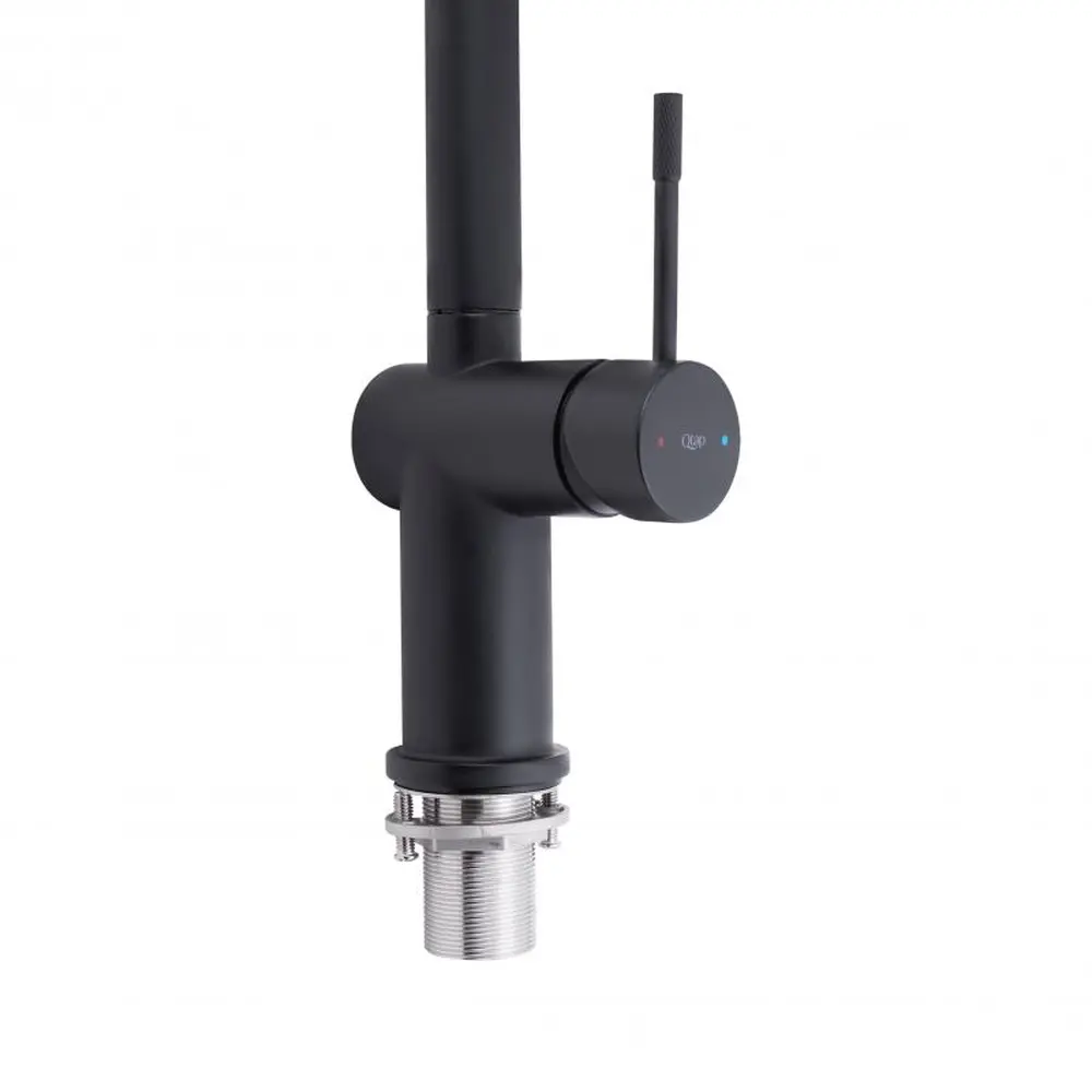 Змішувач для кухні з висувним виливом Qtap Scorpio 9050105FB виготовлено з високоякісної латуні з матовим чорним покриттям, що забезпечує довговічну безперебійну роботу виробу. Завдяки висувній формі виливу і двом режимам подачі струменя, які перемикаються кнопкою на виливі, можна з легкістю очистити важкодоступні місця на посуді. Довжина висувного шланга - 1470 мм. Управління температурою і напором води здійснюється за допомогою зручного важеля.