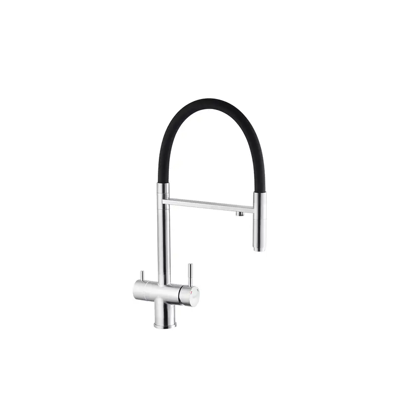 - З одним виливом та окремими каналами для звичайної і фільтрованої води – виглядає, як стандартний змішувач, але має додаткову ручку для керування очищеною водою.