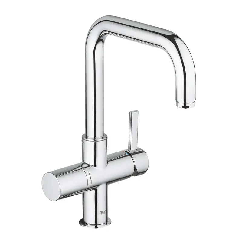 • З одним виливом та окремими каналами для звичайної і фільтрованої води – виглядає, як стандартний змішувач, але має додаткову ручку для керування очищеною водою.