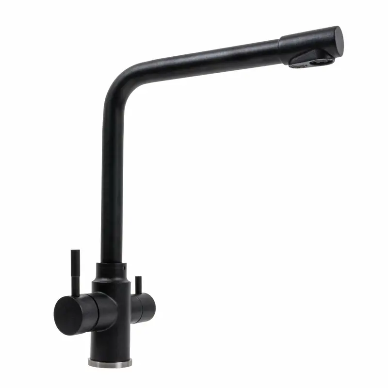 Основна особливість такого змішувача – наявність окремого каналу для фільтрованої води. Це може бути реалізовано у вигляді третього важеля або спеціального окремого виливу. Пристрій підключається до фільтруючої системи, яка встановлюється під мийкою, забезпечуючи постійний доступ до очищеної води для пиття та приготування їжі.