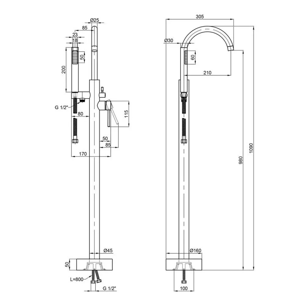 Змішувач для підлоги, лійка для ручного душу, душовий шланг, кріпильні деталі.