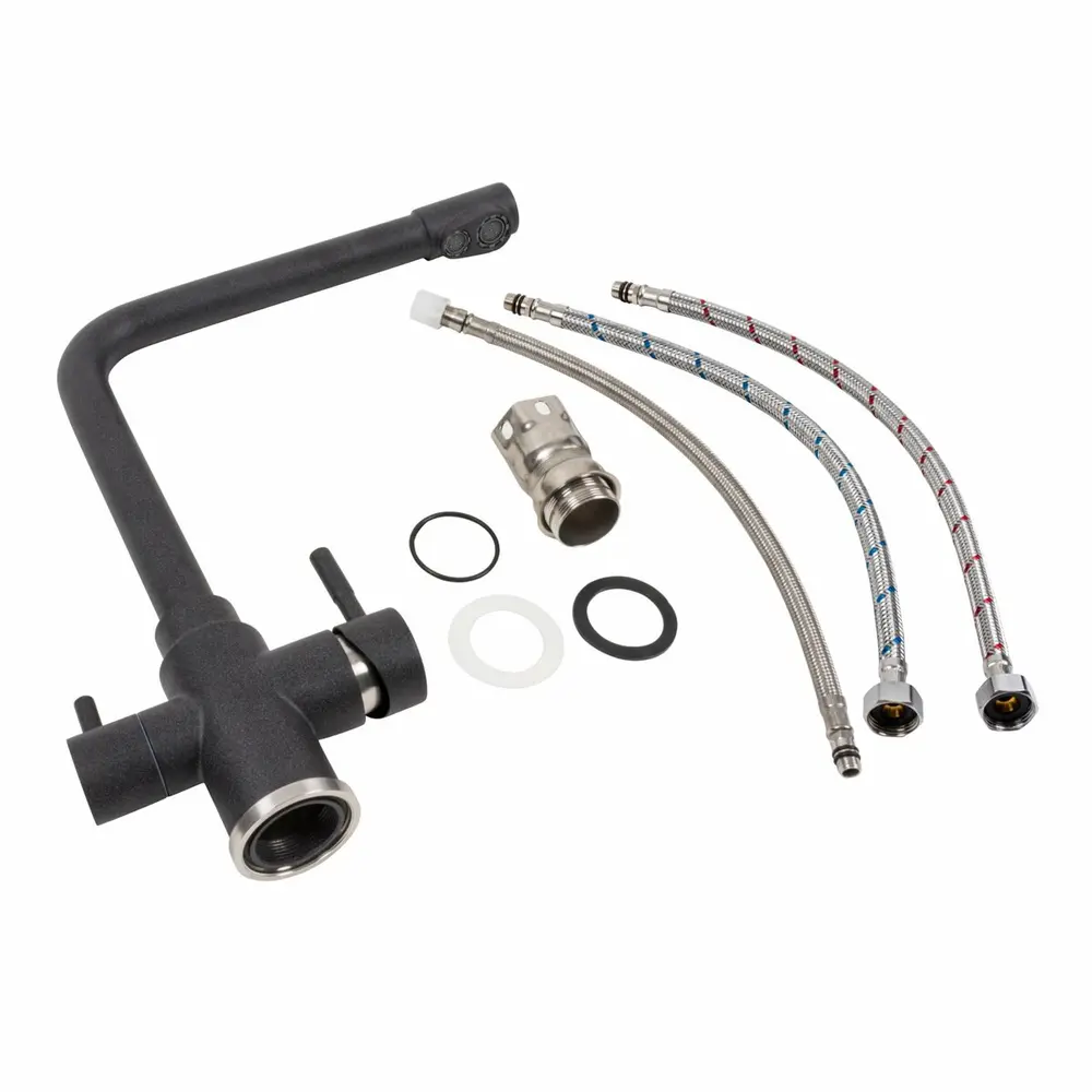 В комплектацию входят гибкая подводка и крепеж, обеспечивая вам все необходимое для быстрого и легкого монтажа. И не забудьте о наших картриджах и гибких шлангах, которые также доступны для приобретения. Ваша кухня заслуживает лучшего, выбирайте Platinum KT 8201 Карбон и почувствуйте роскошь в каждой капле воды!