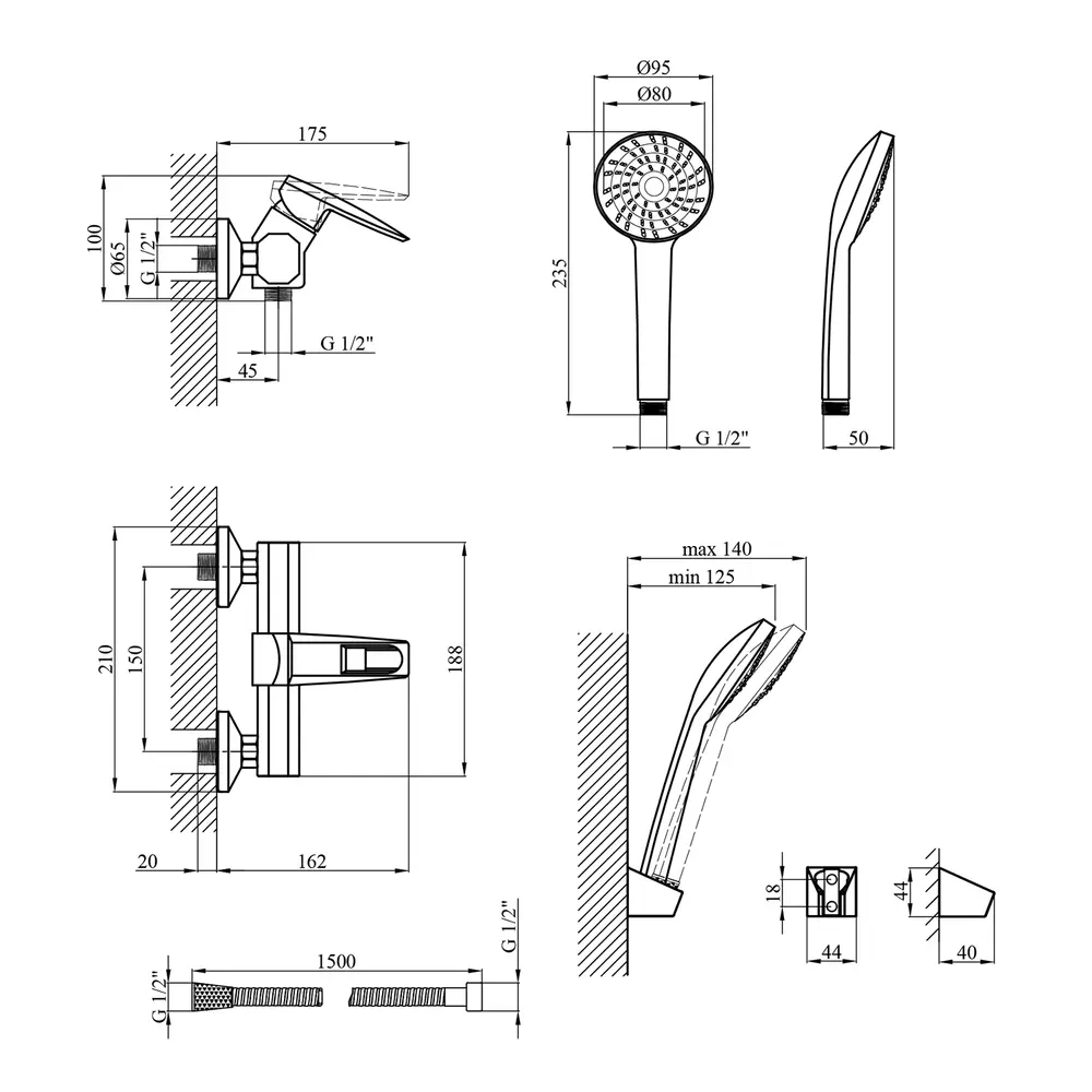 Змішувач, лійка для ручного душу, душовий шланг, кронштейн, кріплення, інструкція.