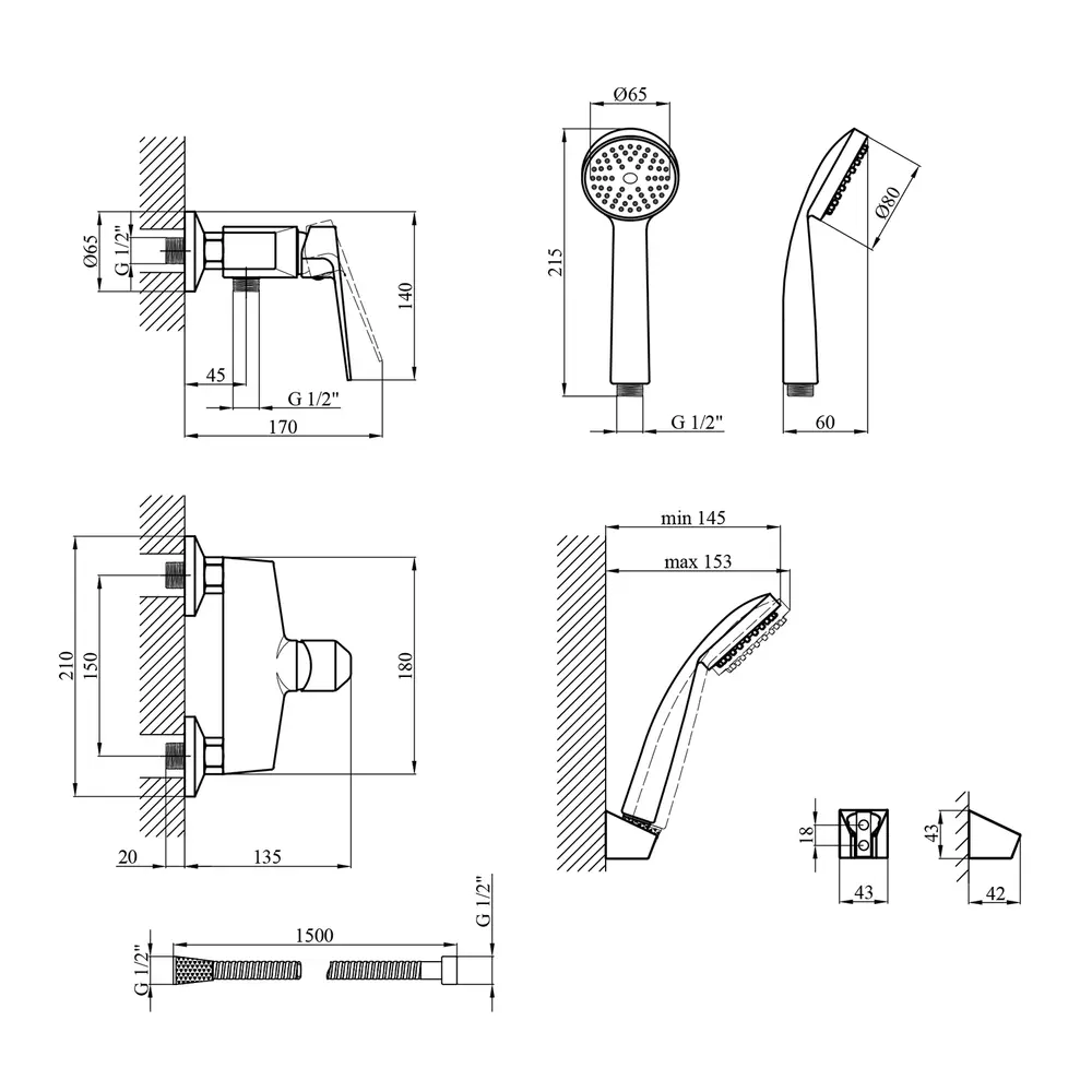 Змішувач, лійка для ручного душу, душовий шланг, кронштейн, кріплення, інструкція.