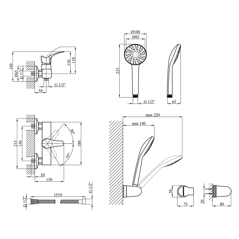 Змішувач, лійка для ручного душу, душовий шланг, кронштейн, кріплення, інструкція.