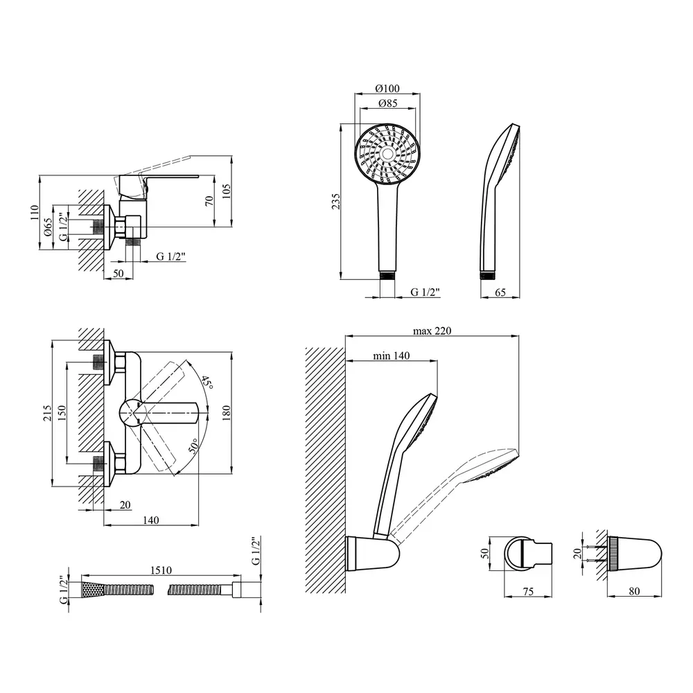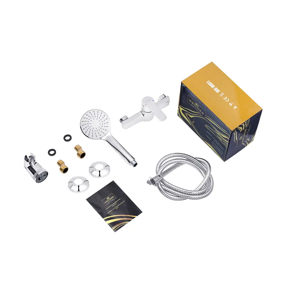 Змішувач, лійка для ручного душу, душовий шланг, кронштейн, кріплення, інструкція.