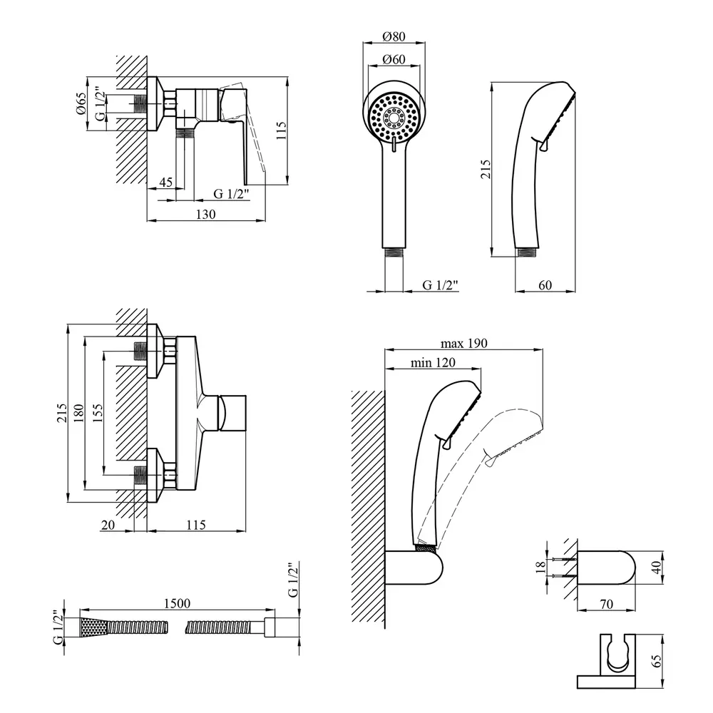 Змішувач, лійка для ручного душу, душовий шланг, кронштейн, кріплення, інструкція.