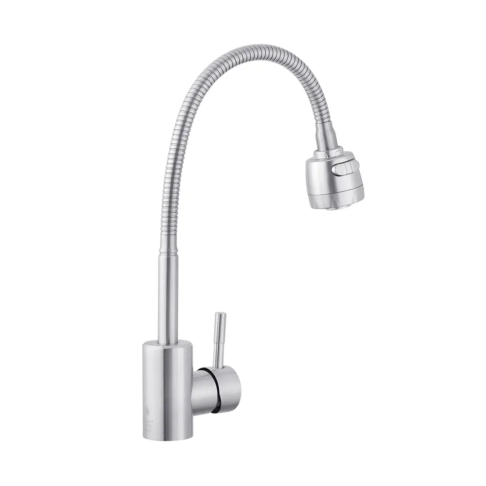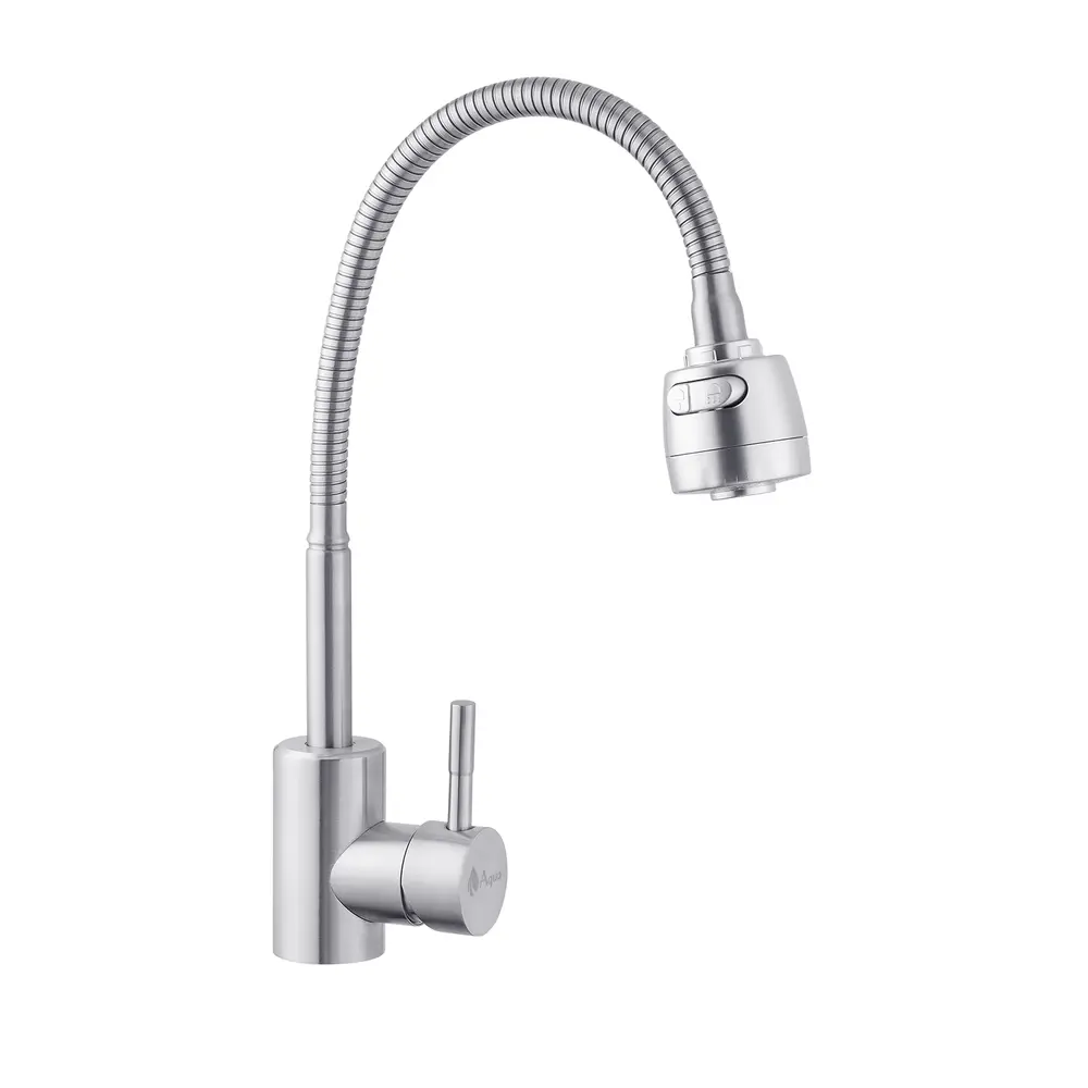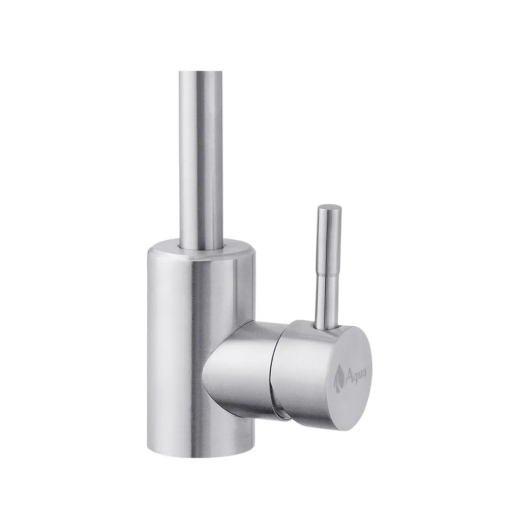 Одноважільний врізний кухонний змішувач від AGUA виготовлений із нержавіючої сталі марки AISI 304, має поворотний вилив і встановлюється на один отвір із підведенням води за допомогою гнучких шлангів М10х1/2". Шлангами не укомплектований.