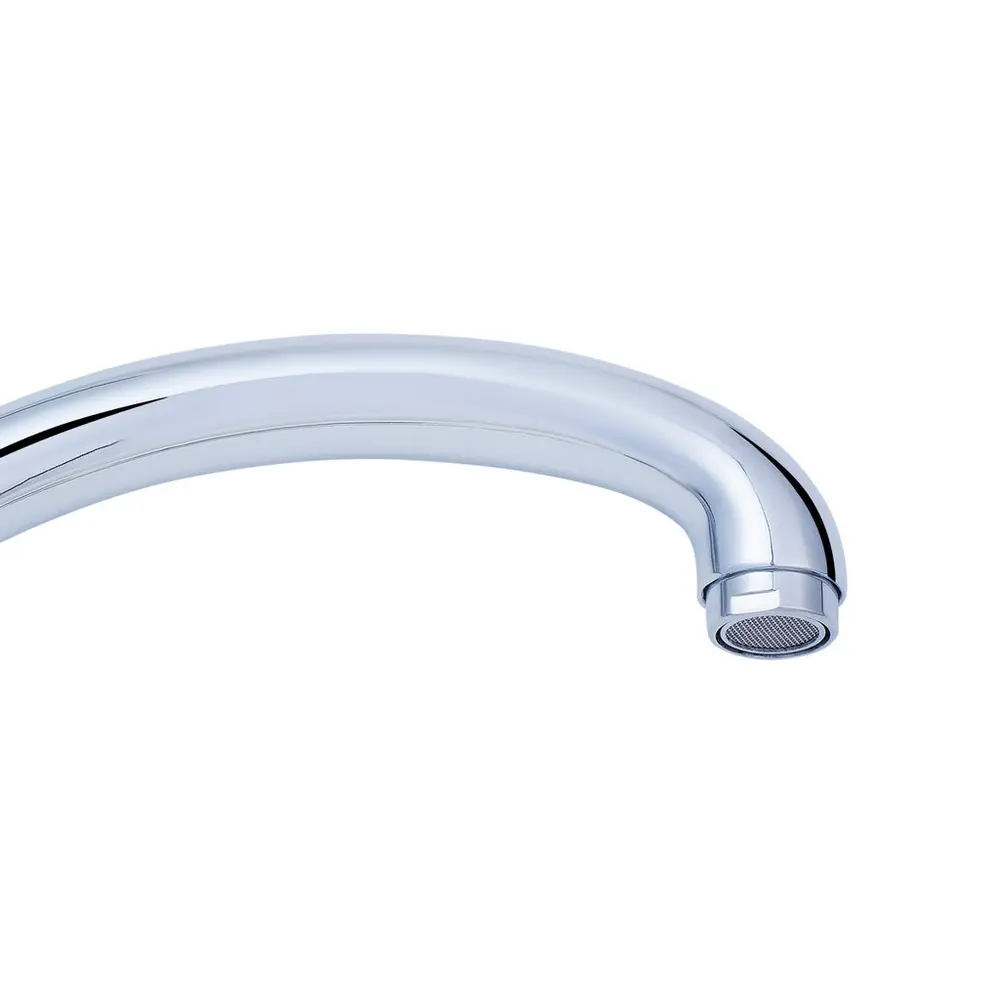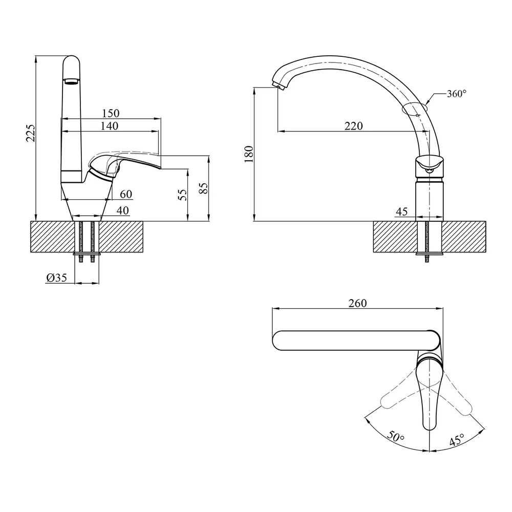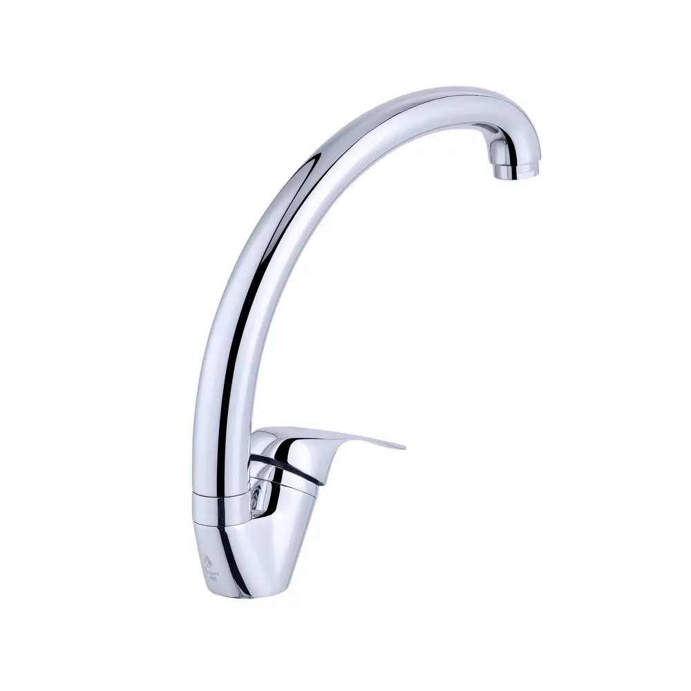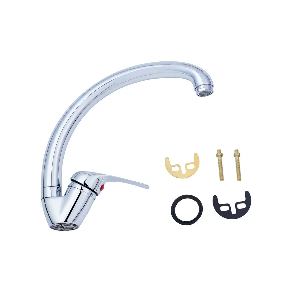 Одноважільний врізний кухонний змішувач від AGUA виготовлений із силуміну з хромованим покриттям, має поворотний вилив і встановлюється на один отвір із підведенням води за допомогою гнучких шлангів М10х1/2". Шлангами не укомплектований.