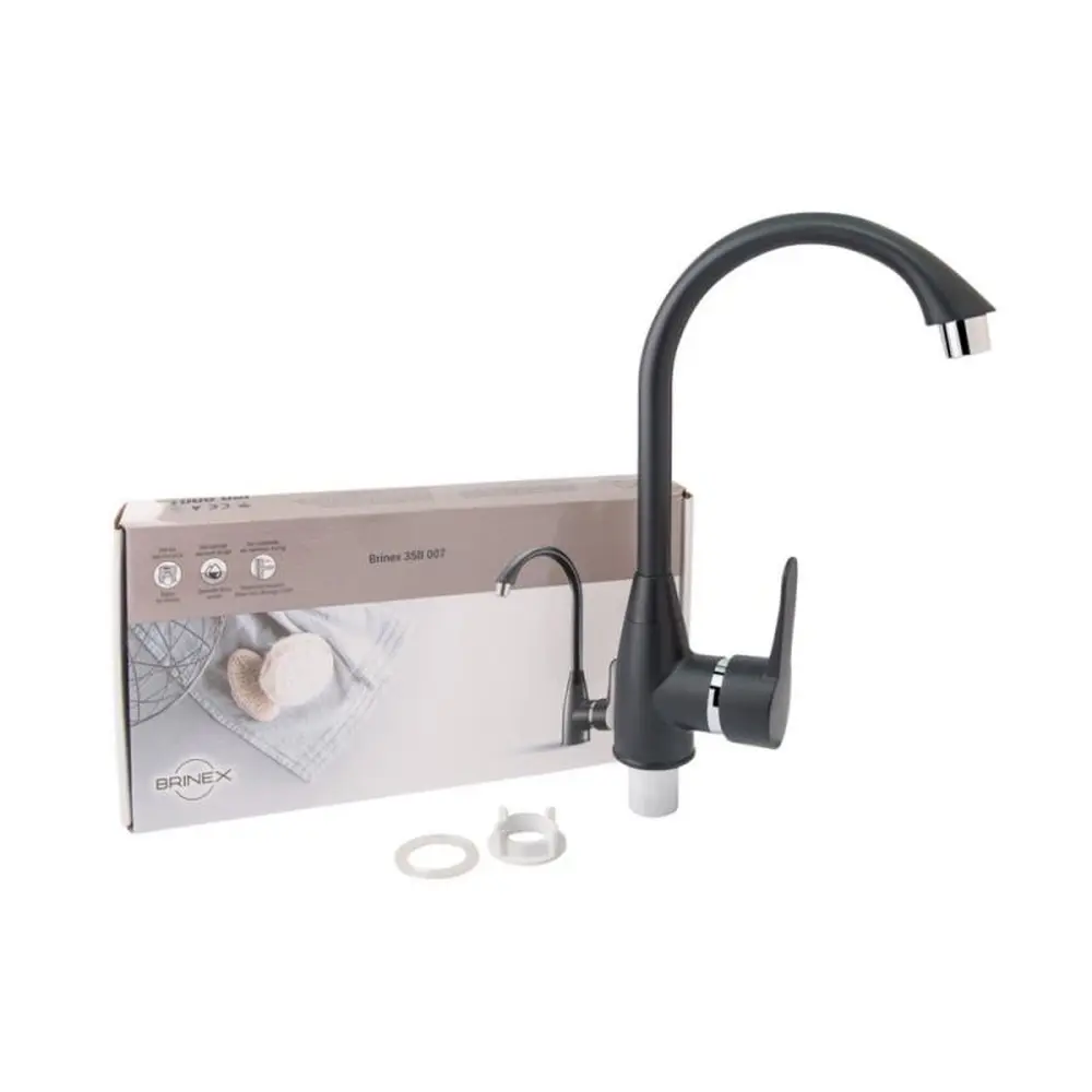 Змішувач для кухні Brinex 35B 007 виготовлений з ABS пластику. Має одноважільне управління, яке регулює натиск холодної та гарячої води. Виконаний в сучасному, стриманому дизайні з чорною матовою поверхнею. Такий змішувач буде оригінально виглядати в інтер‘єрі кухні.