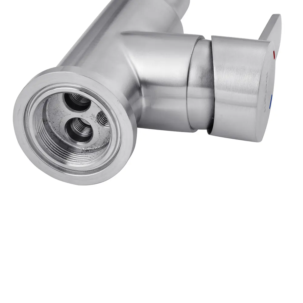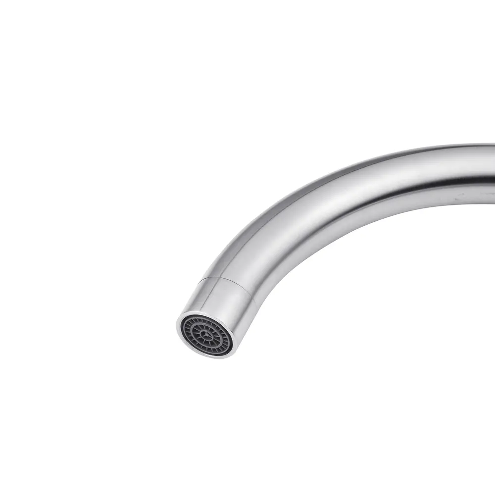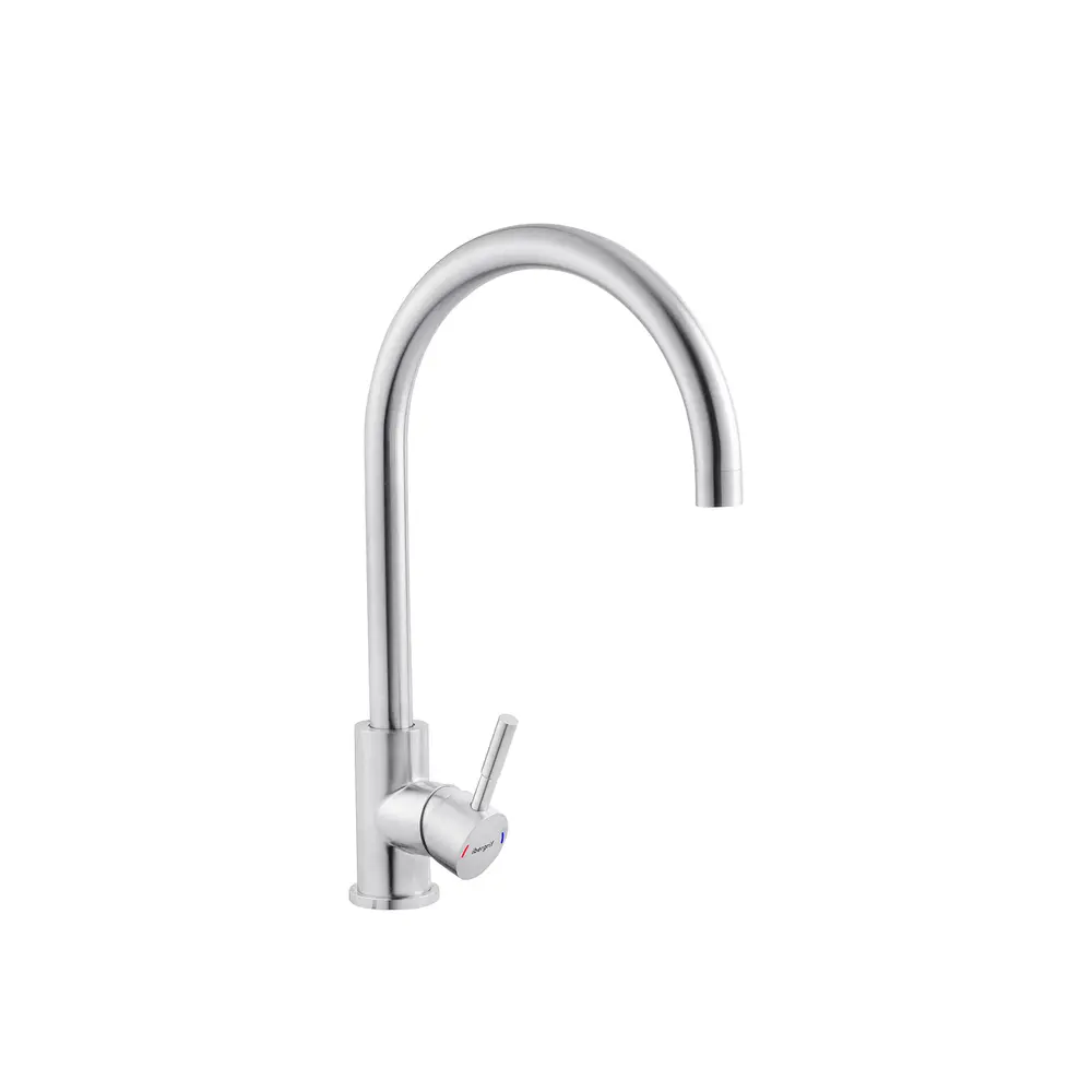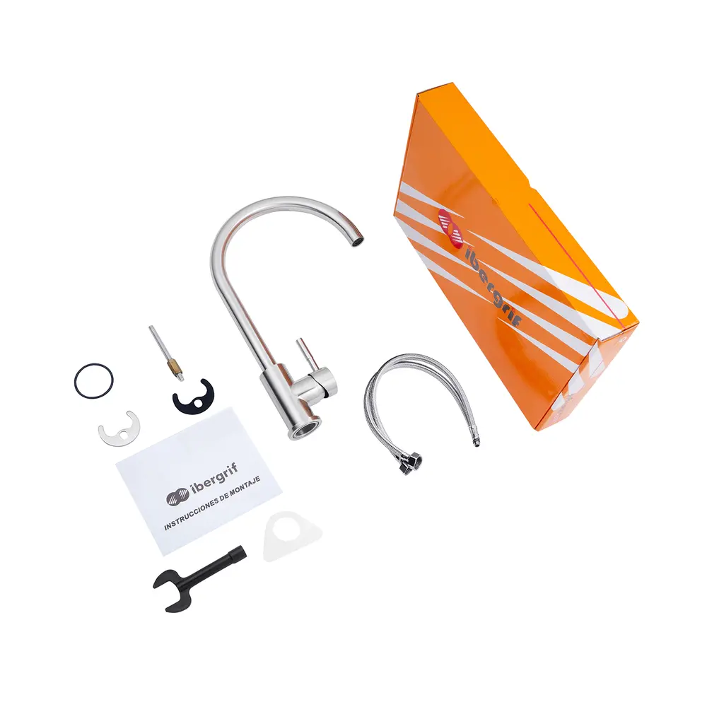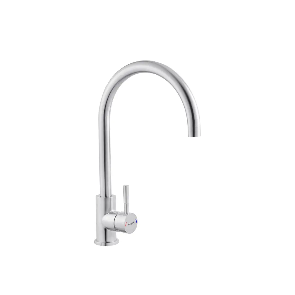 Змішувач для кухні з нержавіючої сталі Ibergrif M22110 з високим поворотним виливом, який легко наповнить навіть високу ємність. Ця модель зроблена з нержавіючої сталі SUS 304, цей сплав має достатню міцність, щоб витримати практично будь-які умови експлуатації. Він міцний, не схильний до корозії, стійкий до температурних перепадів. За змішування води відповідає керамічний картридж 35 мм. Керувати натиском струменя допомагає класична поворотна рукоятка. Кріплення змішувача здійснюється на мийці або стільниці на 1 отвір за допомогою шпильки.