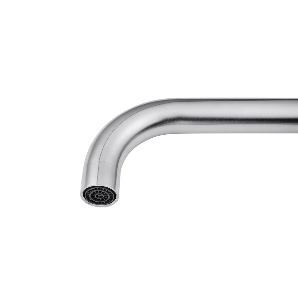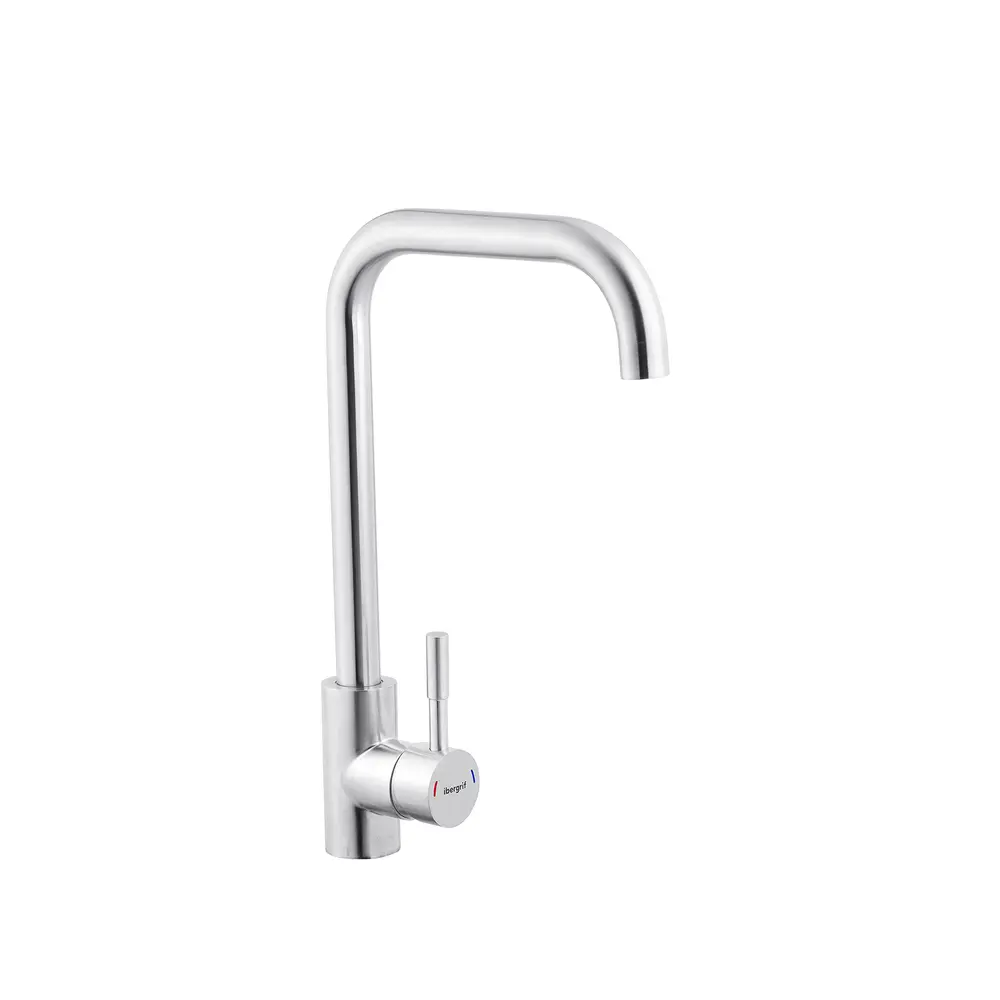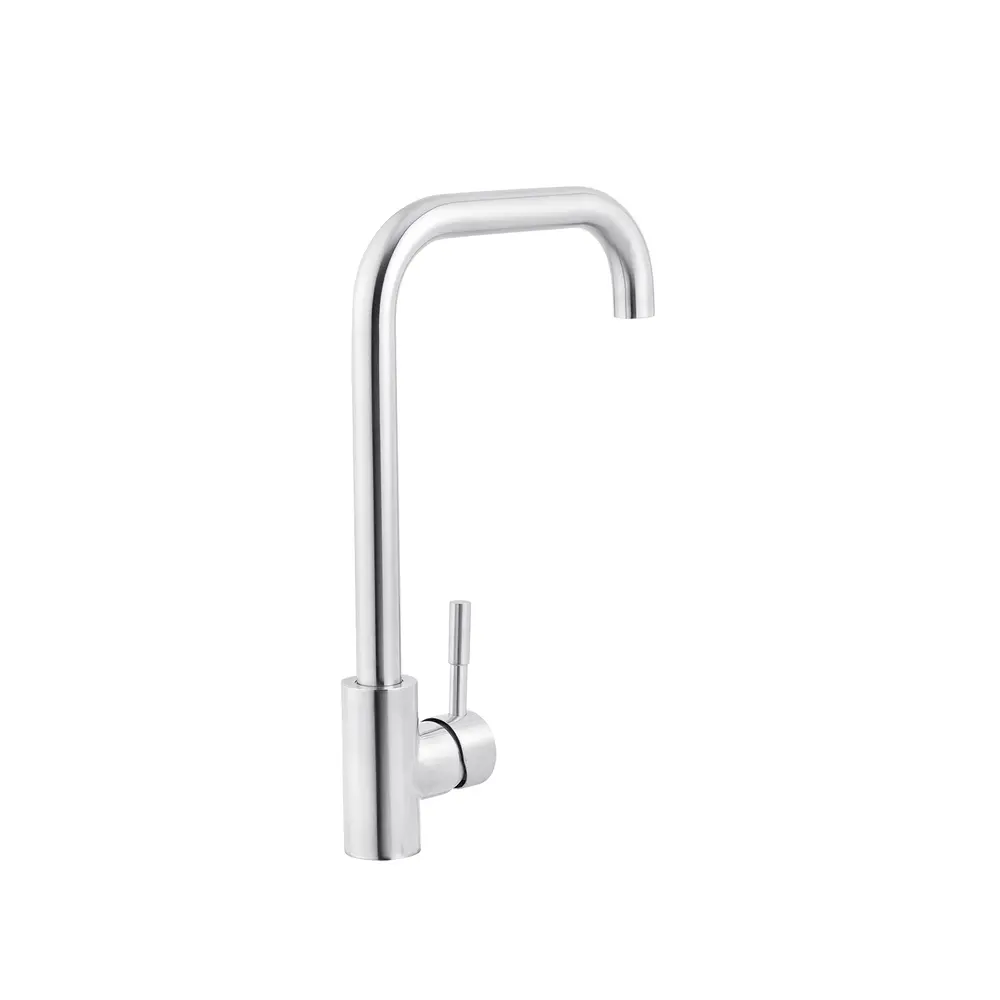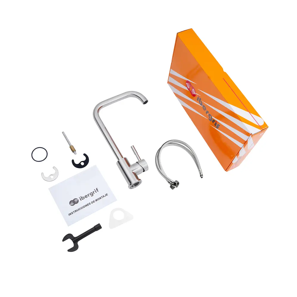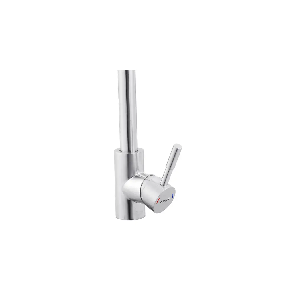 Змішувач для кухні з нержавіючої сталі Ibergrif M22111 з високим поворотним виливом, який легко наповнить навіть високу ємність. Ця модель зроблена з нержавіючої сталі SUS 304, цей сплав має достатню міцність, щоб витримати практично будь-які умови експлуатації. Він міцний, не схильний до корозії, стійкий до температурних перепадів. За змішування води відповідає керамічний картридж 35 мм. Керувати натиском струменя допомагає класична поворотна рукоятка. Кріплення змішувача здійснюється на мийці або стільниці на 1 отвір за допомогою шпильки.