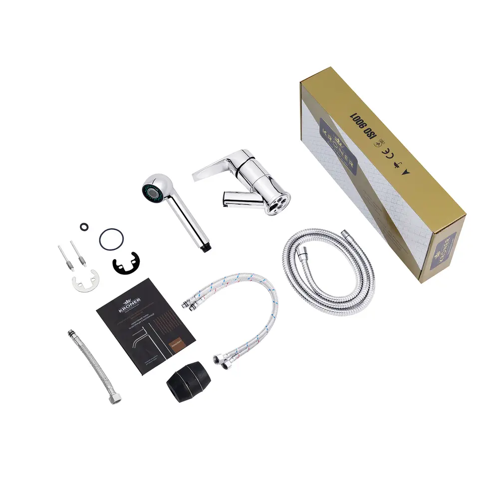 Змішувач, гибкая подводка, шланг для выдвижной лейки, лейка, якорь, крепежи.
