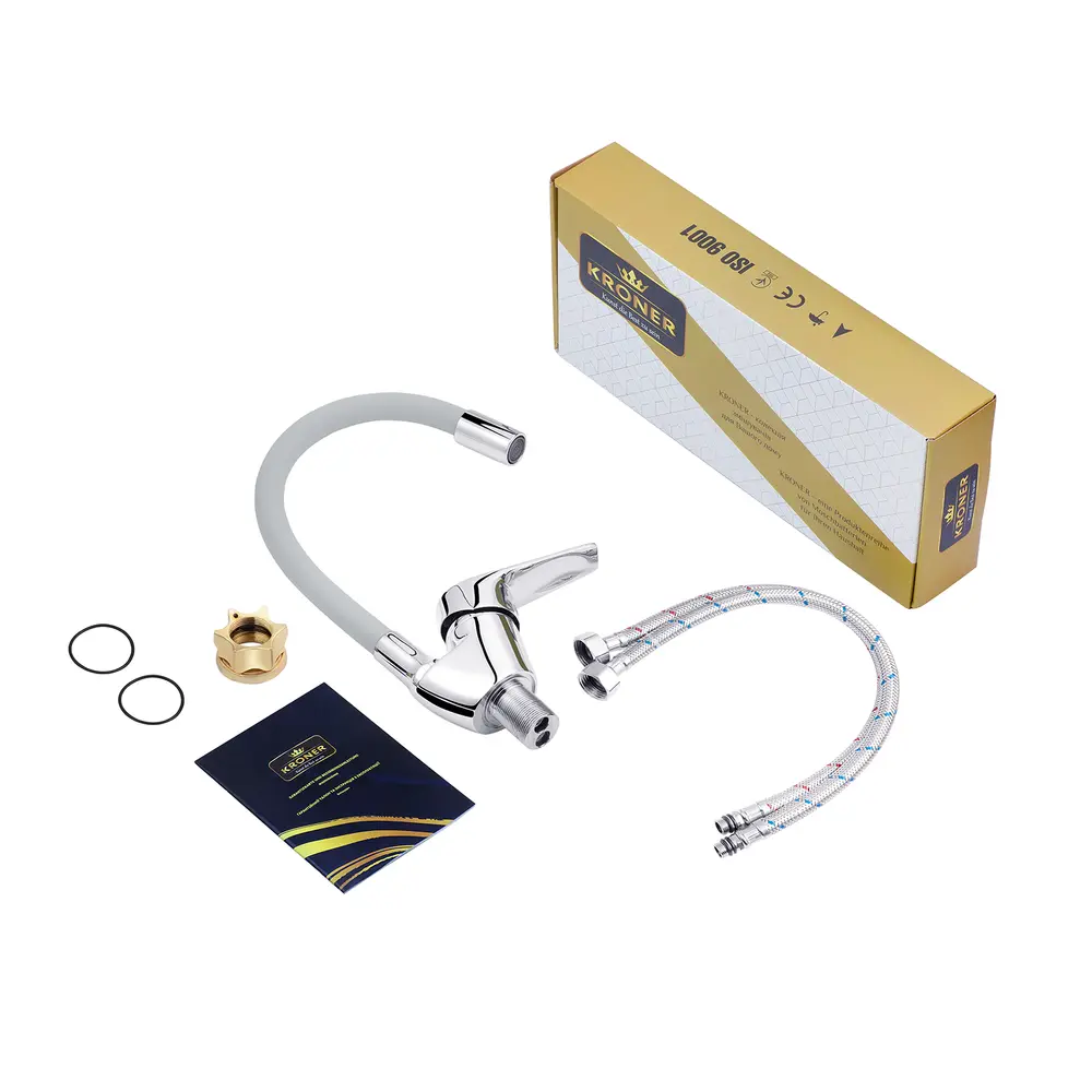 Кухонні змішувачі від KRONER – це німецька якість, технологія та надійність. Сучасний дизайн стане вдалим доповненням інтер’єру кухні. Виготовленні з якісних матеріалів, що не піддаються корозії, легкість у збірці не завдасть клопоту при монтажу та використанні. Мають поворотний вилив і встановлюється на один отвір із підведенням води за допомогою гнучких шлангів М10х1/2". Шланги для підключення входять у комплект. Данна модель виготовлена з силуміну.