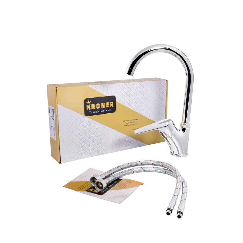 Кухонні змішувачі від KRONER – це німецька якість, технологія та надійність. Сучасний дизайн стане вдалим доповненням інтер’єру кухні. Виготовленні з якісних матеріалів, що не піддаються корозії, легкість у збірці не завдасть клопоту при монтажу та використанні. Мають поворотний вилив і встановлюється на один отвір із підведенням води за допомогою гнучких шлангів М10х1/2". Шланги для підключення входять у комплект. Данна модель виготовлена з силуміну.