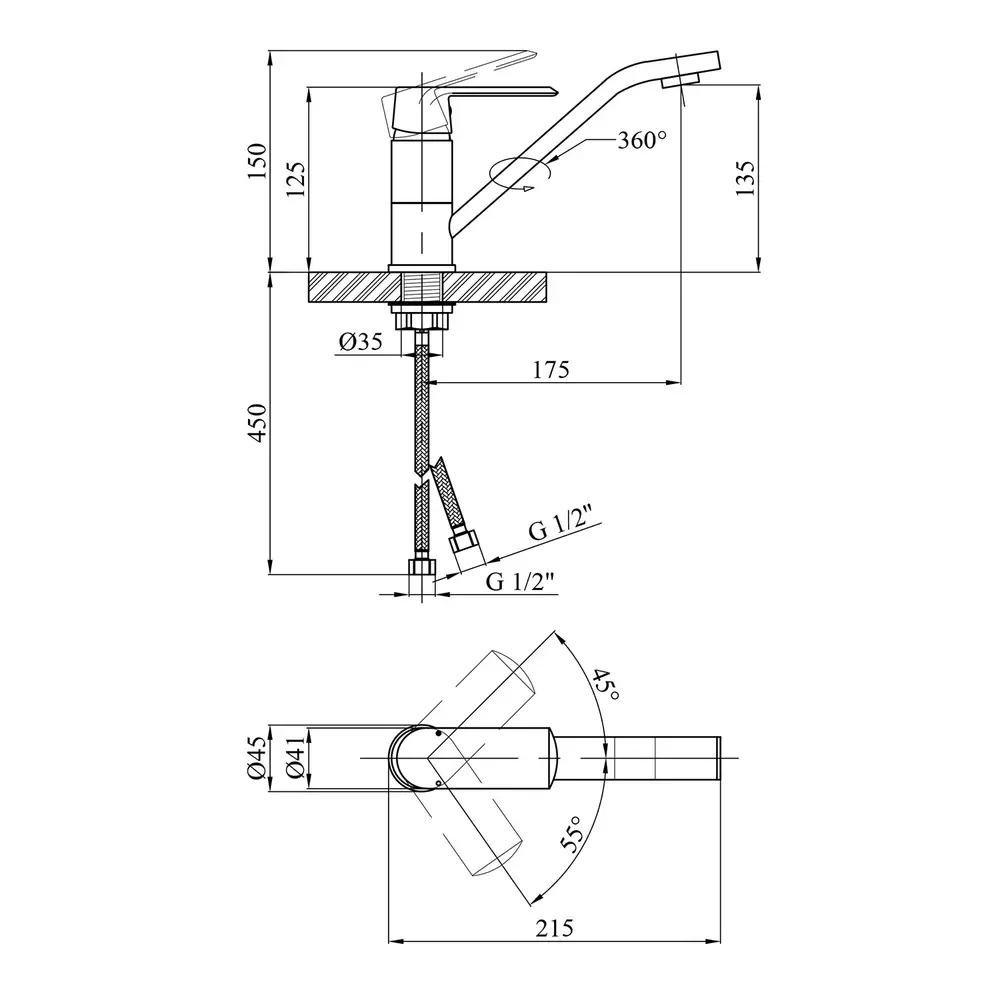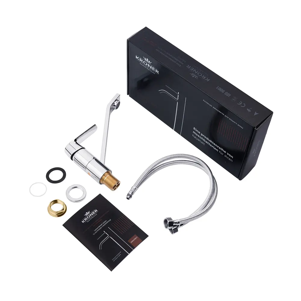 Кухонні змішувачі від KRONER – це німецька якість, технологія та надійність. Сучасний дизайн стане вдалим доповненням інтер’єру кухні. Виготовленні з якісних матеріалів, що не піддаються корозії, легкість у збірці не завдасть клопоту при монтажу та використанні. Мають поворотний вилив і встановлюється на один отвір із підведенням води за допомогою гнучких шлангів М10х1/2". Шланги для підключення входять у комплект. Данна модель виготовлена з латуні.