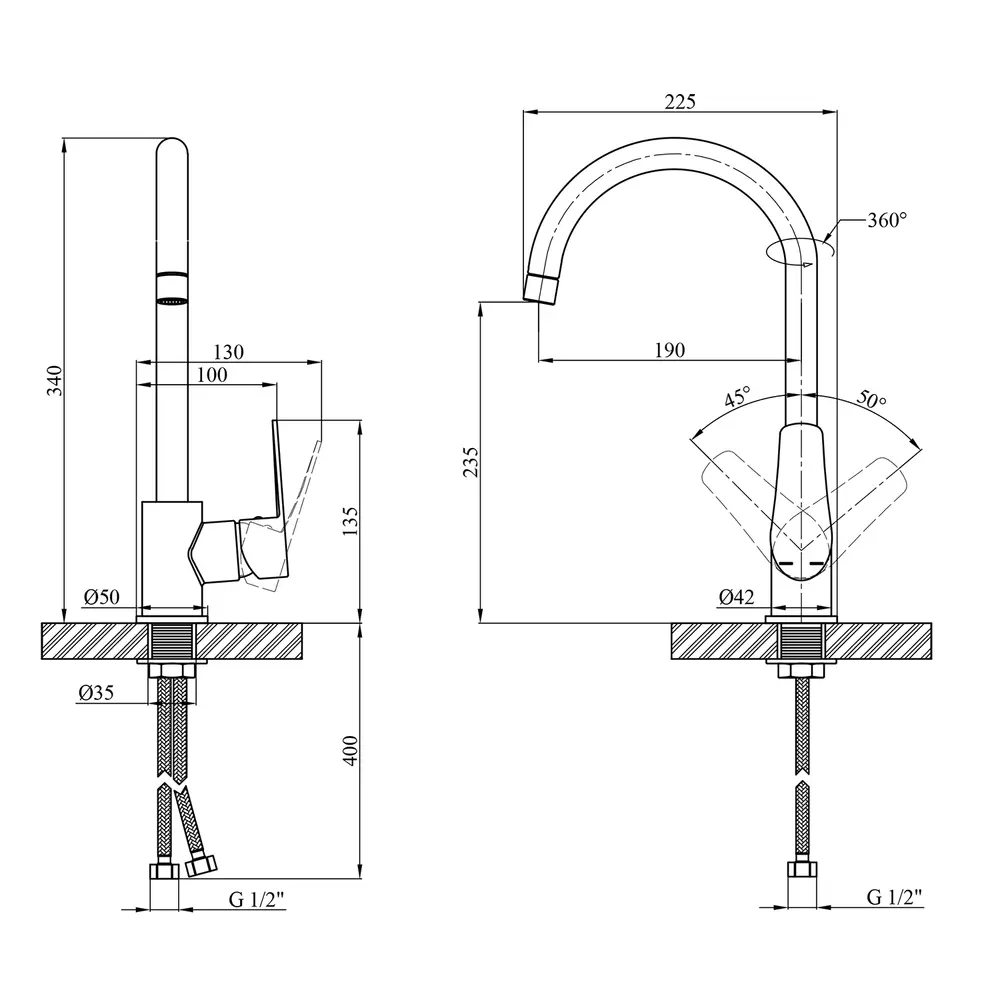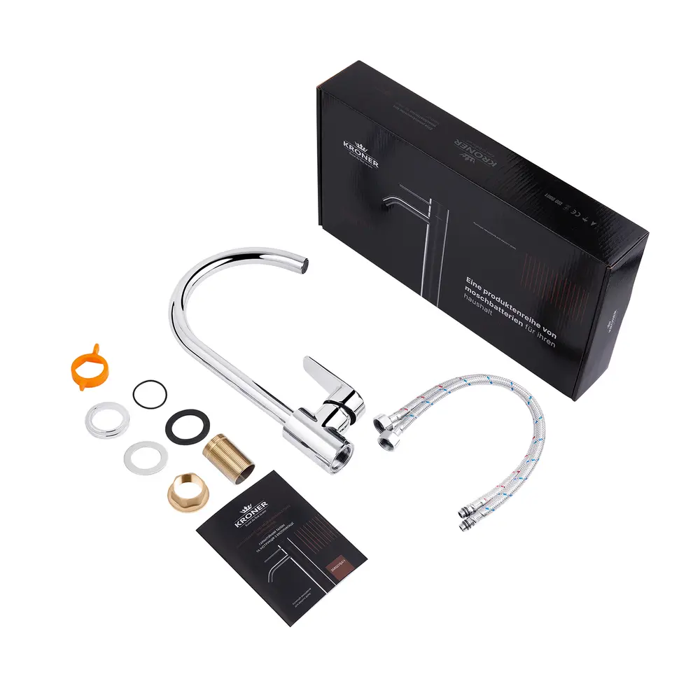 Кухонні змішувачі від KRONER – це німецька якість, технологія та надійність. Сучасний дизайн стане вдалим доповненням інтер’єру кухні. Виготовленні з якісних матеріалів, що не піддаються корозії, легкість у збірці не завдасть клопоту при монтажу та використанні. Мають поворотний вилив і встановлюється на один отвір із підведенням води за допомогою гнучких шлангів М10х1/2". Шланги для підключення входять у комплект. Данна модель виготовлена з латуні.