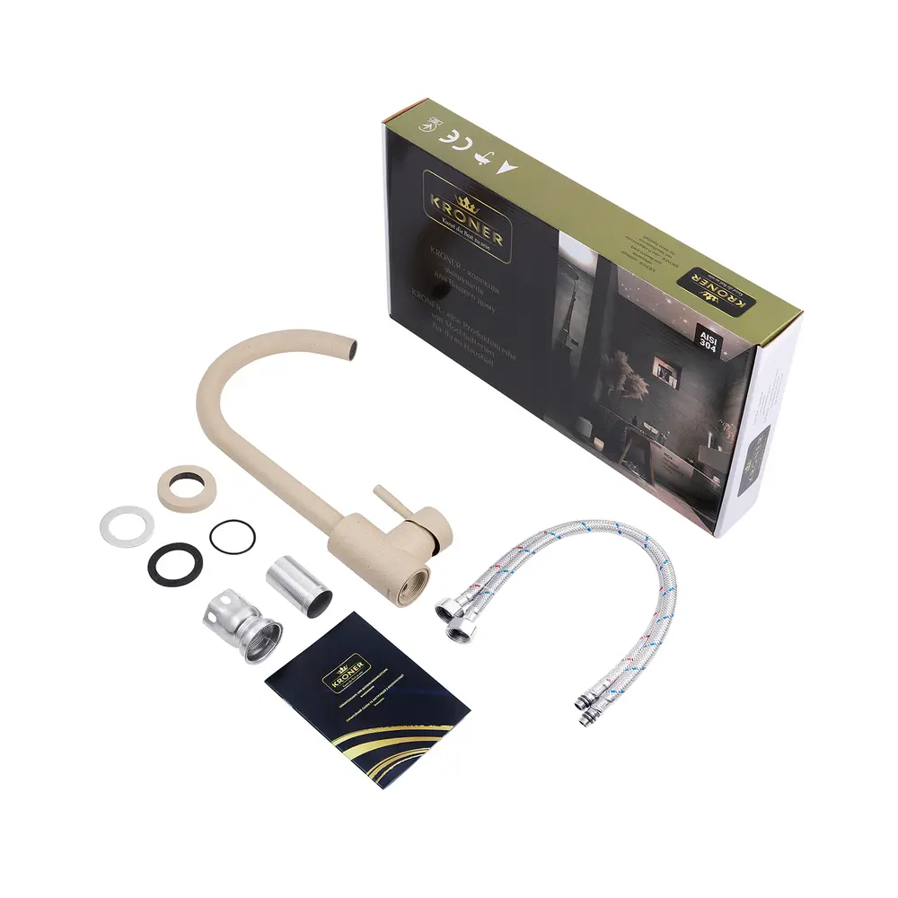 Кухонні змішувачі від KRONER – це німецька якість, технологія та надійність. Сучасний дизайн стане вдалим доповненням інтер’єру кухні. Виготовленні з якісних матеріалів, що не піддаються корозії, легкість у збірці не завдасть клопоту при монтажу та використанні. Мають поворотний вилив і встановлюється на один отвір із підведенням води за допомогою гнучких шлангів М10х1/2". Шланги для підключення входять у комплект. Данна модель виготовлена з нержавіючої сталі AISI 304.