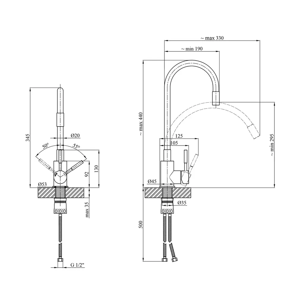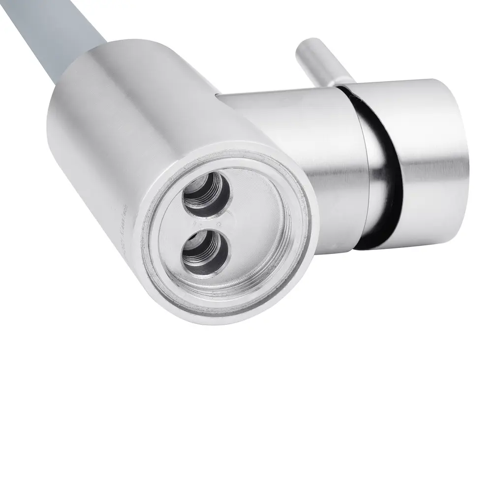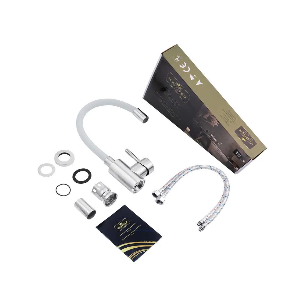 Кухонні змішувачі від KRONER – це німецька якість, технологія та надійність. Сучасний дизайн стане вдалим доповненням інтер’єру кухні. Виготовленні з якісних матеріалів, що не піддаються корозії, легкість у збірці не завдасть клопоту при монтажу та використанні. Мають поворотний вилив і встановлюється на один отвір із підведенням води за допомогою гнучких шлангів М10х1/2". Шланги для підключення входять у комплект. Данна модель виготовлена з нержавіючої сталі AISI 304.