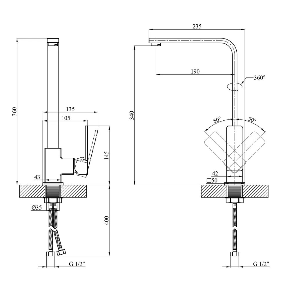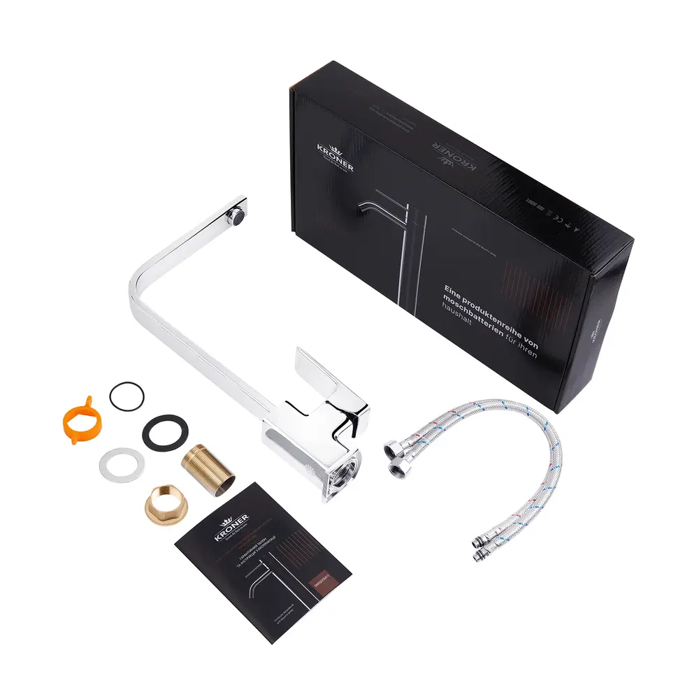 Кухонні змішувачі від KRONER – це німецька якість, технологія та надійність. Сучасний дизайн стане вдалим доповненням інтер’єру кухні. Виготовленні з якісних матеріалів, що не піддаються корозії, легкість у збірці не завдасть клопоту при монтажу та використанні. Мають поворотний вилив і встановлюється на один отвір із підведенням води за допомогою гнучких шлангів М10х1/2". Шланги для підключення входять у комплект. Данна модель виготовлена з латуні.