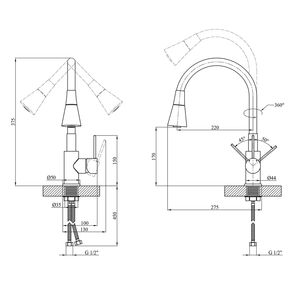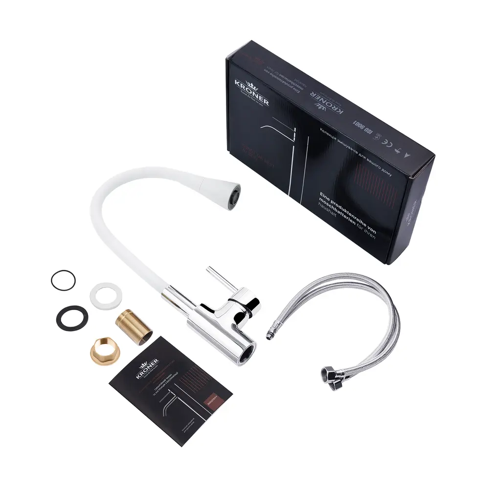 Кухонні змішувачі від KRONER – це німецька якість, технологія та надійність. Сучасний дизайн стане вдалим доповненням інтер’єру кухні. Виготовленні з якісних матеріалів, що не піддаються корозії, легкість у збірці не завдасть клопоту при монтажу та використанні. Мають поворотний вилив і встановлюється на один отвір із підведенням води за допомогою гнучких шлангів М10х1/2". Шланги для підключення входять у комплект. Данна модель виготовлена з латуні.