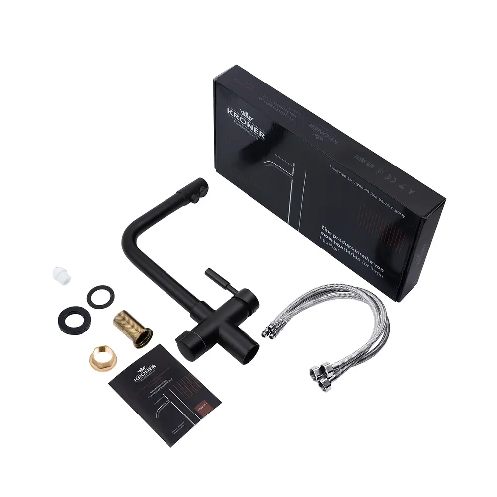 Кухонні змішувачі від KRONER – це німецька якість, технологія та надійність. Сучасний дизайн стане вдалим доповненням інтер’єру кухні. Виготовленні з якісних матеріалів, що не піддаються корозії, легкість у збірці не завдасть клопоту при монтажу та використанні. Мають поворотний вилив і встановлюється на один отвір із підведенням води за допомогою гнучких шлангів М10х1/2". Шланги для підключення входять у комплект. Данна модель виготовлена з латуні.
