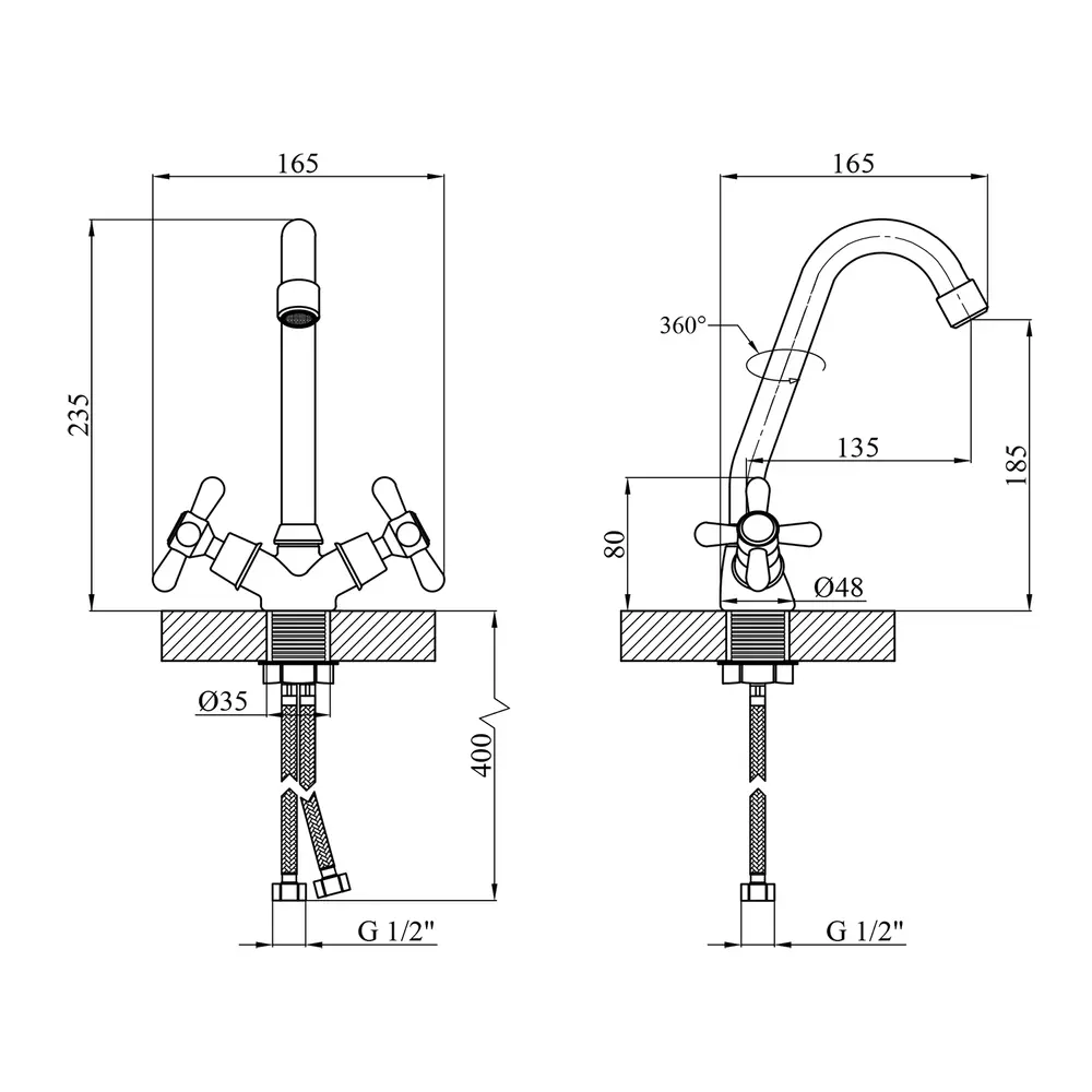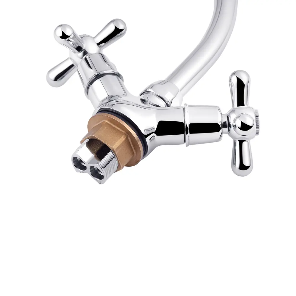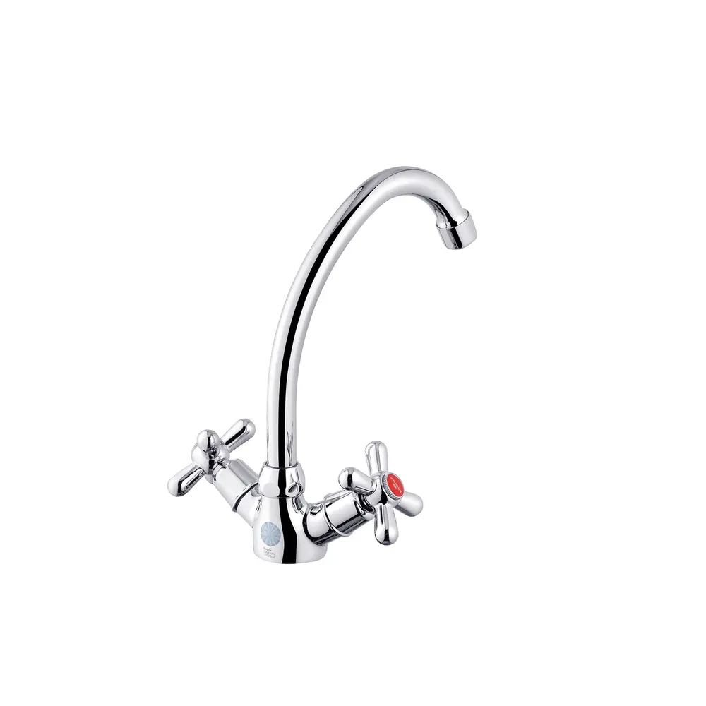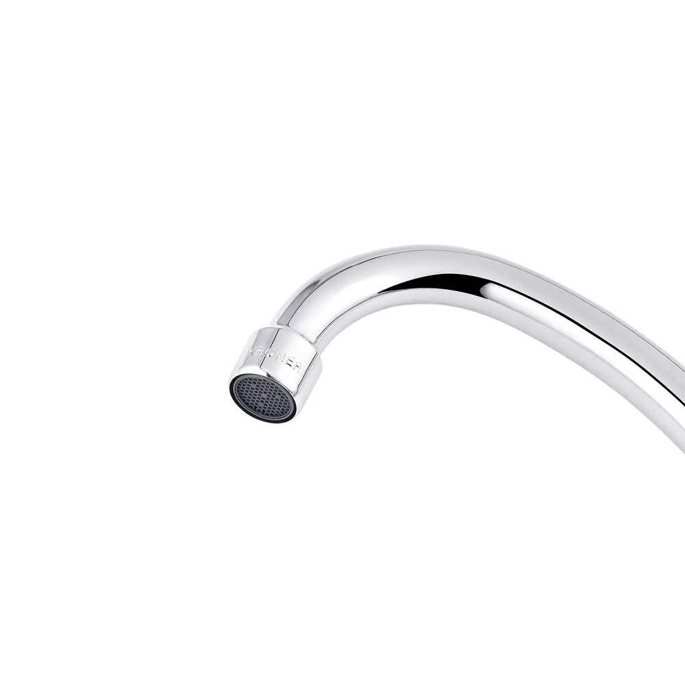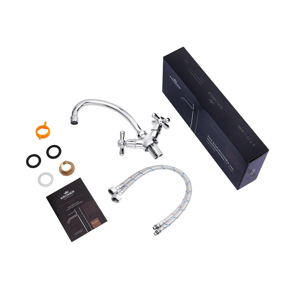 Змішувач для кухні Kroner KRP Royce-C030 виготовлений з високоякісної харчової латуні, яка стійка до впливу корозії, ударів і появи тріщин. Глянсове хромоване покриття не тільки підвищує довговічність змішувача, а й надає йому привабливості. Змішувач має вентильне управління, за допомогою якого можна відрегулювати температуру і натиск холодної та гарячої води. Виконаний в сучасному дизайні з поворотним виливом, який ідеально доповнить інтер‘єр кухні.