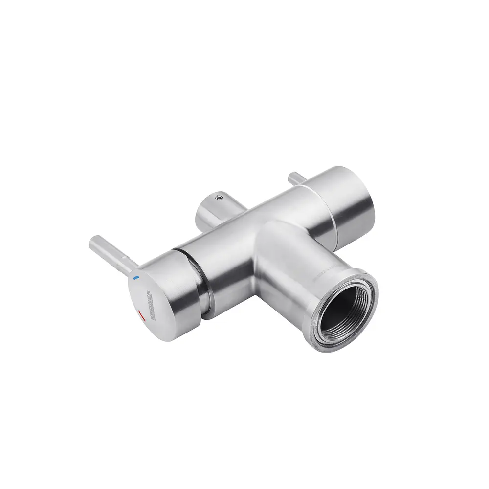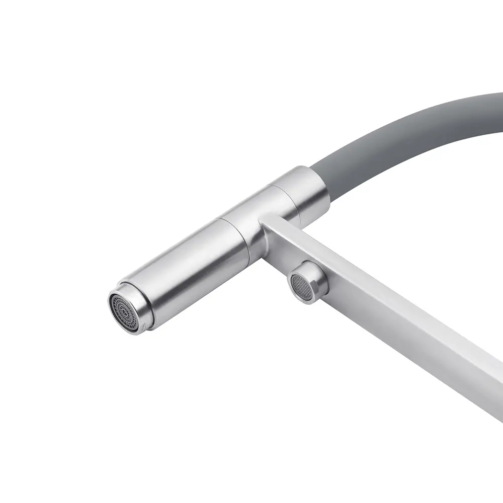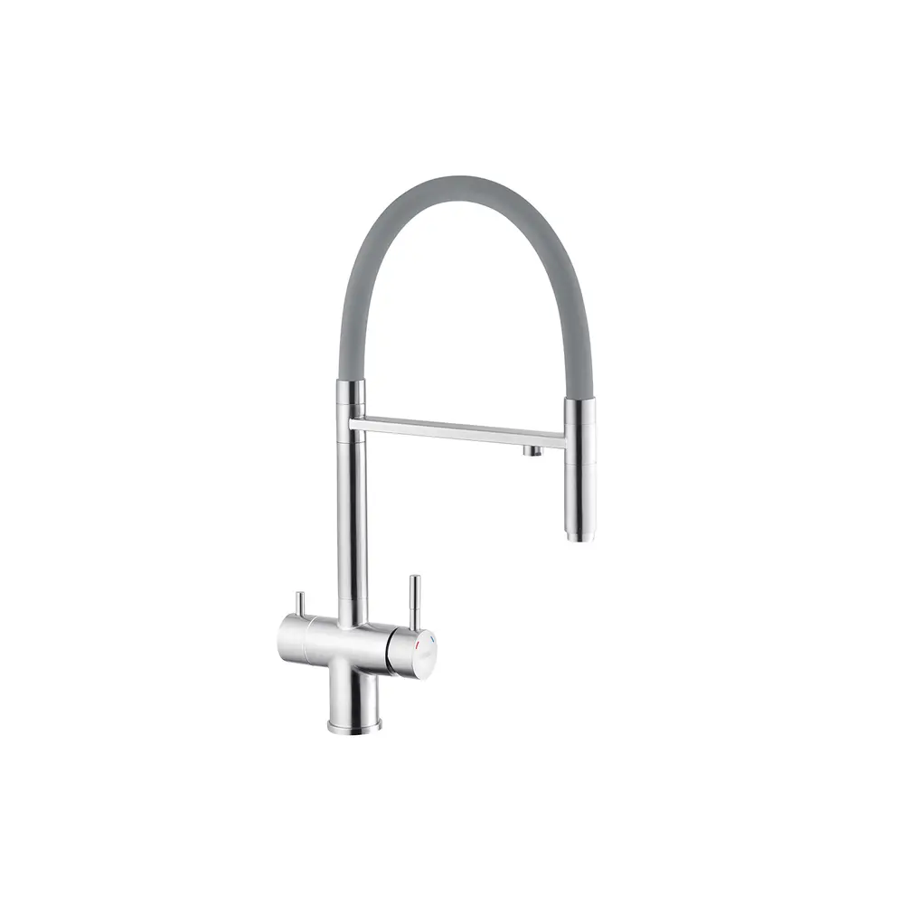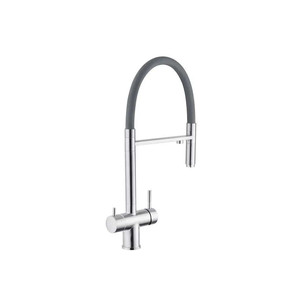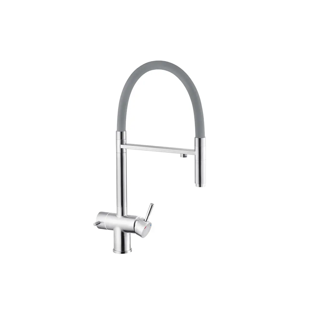 Змішувач для кухні з підключенням до фільтру Kroner (KRP) Edelstahl Klassisch-ESG03815GRA виготовлений з високоякісної нержавіючої сталі, яка не піддається корозії, стійка до ударів та появи тріщин. Змішувач має С-подібну форму з трьома контурами підключення води. За участю першого та другого здійснюється підключення холодної та гарячої води, де змішування відбувається за допомогою картриджа.