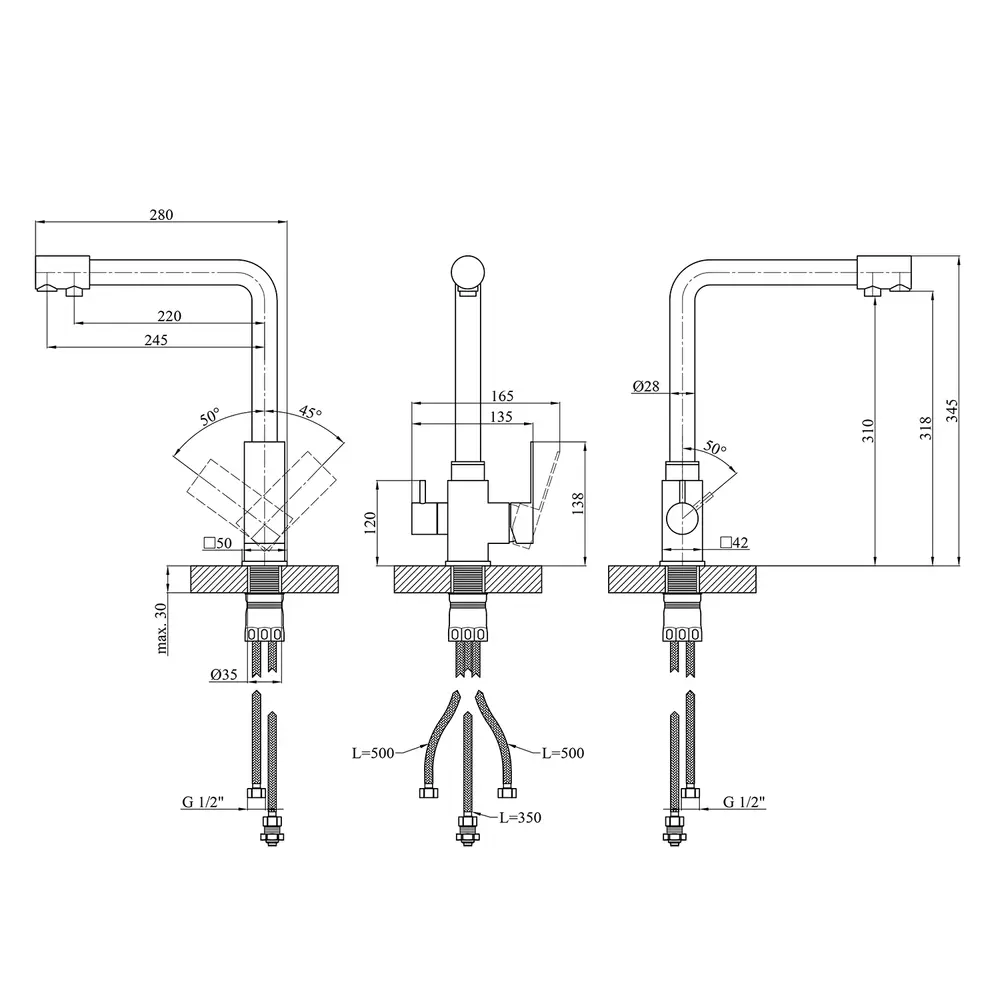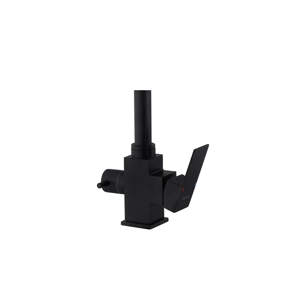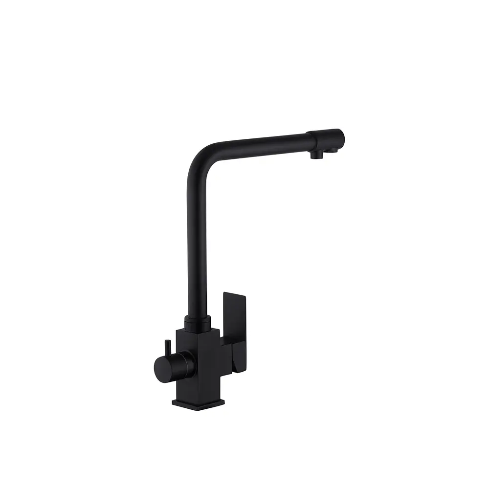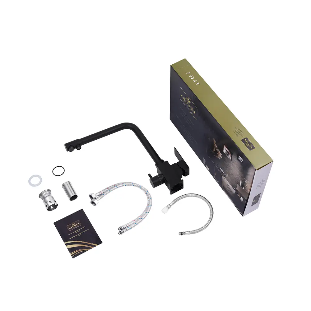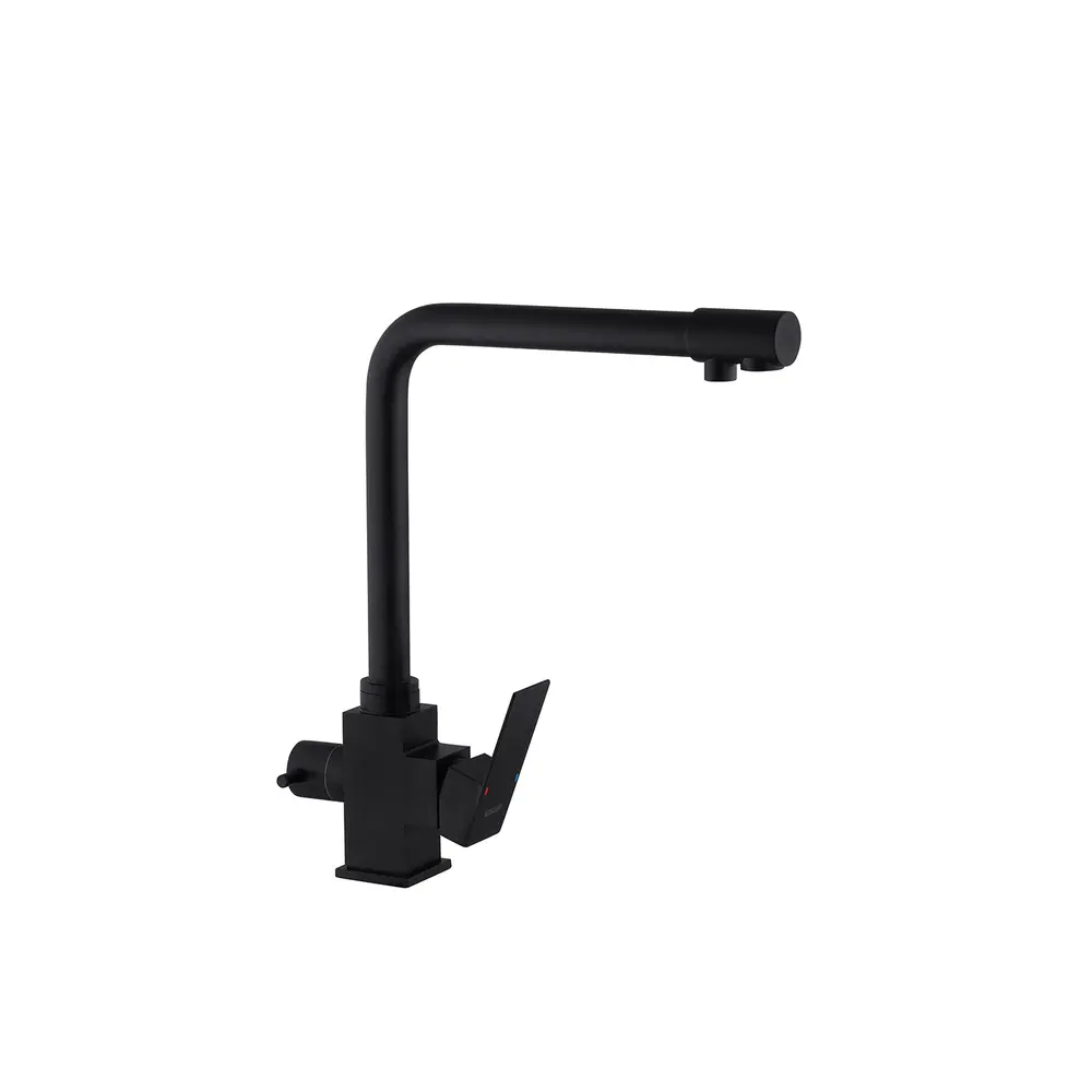 Змішувач для кухні з підключенням до фільтру Kroner (KRP) Edelstahl Kubus-SCH03810 виготовлений з високоякісної нержавіючої сталі, яка не піддається корозії, стійка до ударів та появи тріщин. Змішувач має Г-подібну форму з трьома контурами підключення води. За участю першого та другого здійснюється підключення холодної та гарячої води, де змішування відбувається за допомогою картриджа.