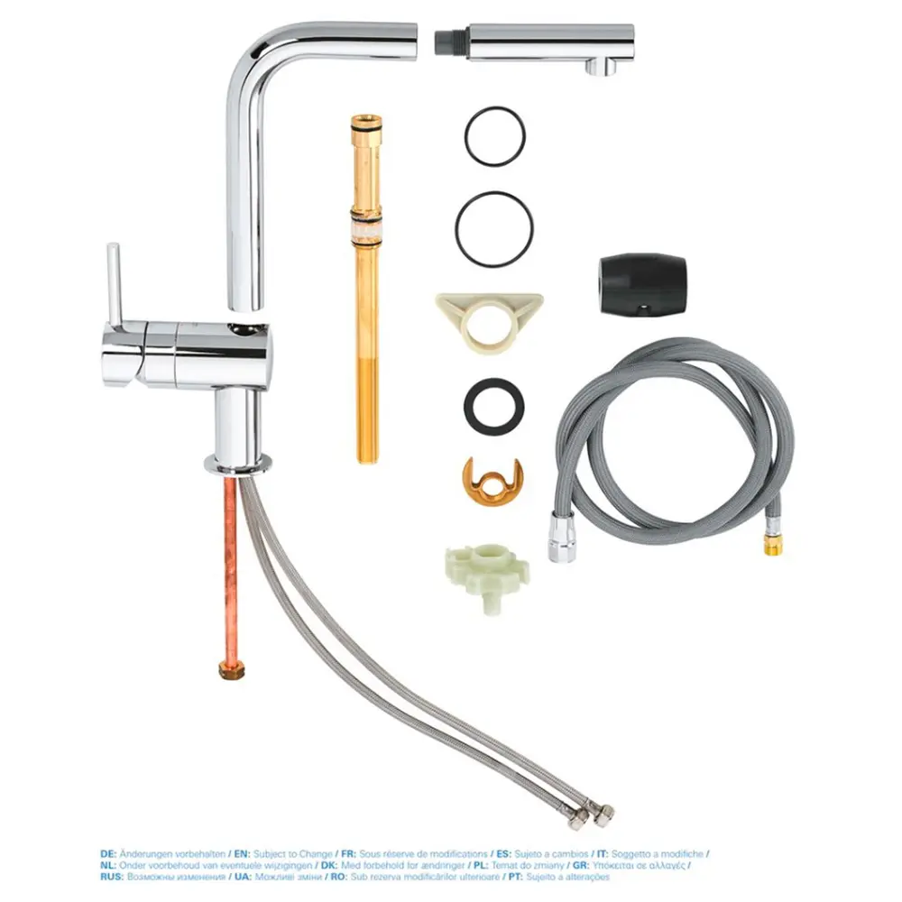 Змішувач для кухні з висувним виливом Grohe Minta 32168000 виготовлений із високоякісної латуні. Завдяки висувній формі виливу можна легко промивати фрукти, овочі, очищати посуд, набирати великі ємності без необхідності ставити їх в мийку. Управління температурою та напором води здійснюється за допомогою зручного важеля.