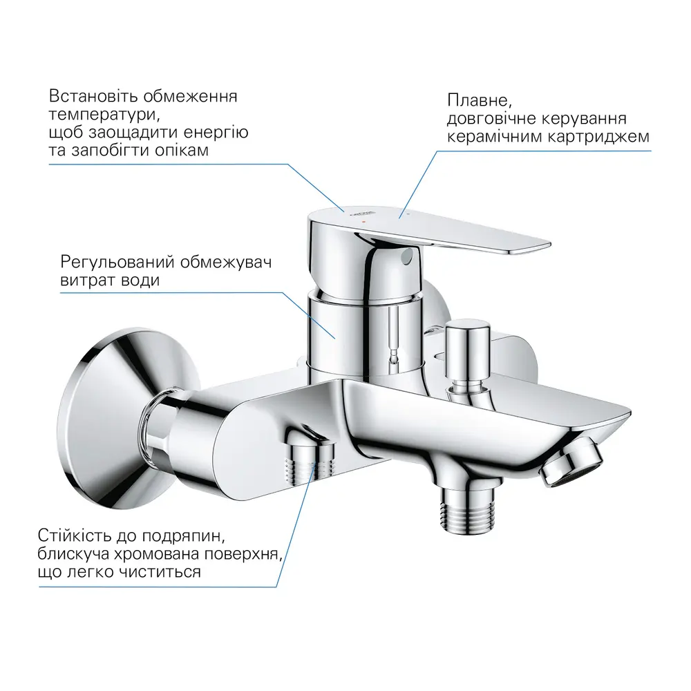 Данная модель имеет совершенный механизм управления GROHE Longlife, предусматривающий абсолютную легкость регулировки температуры и напора воды.