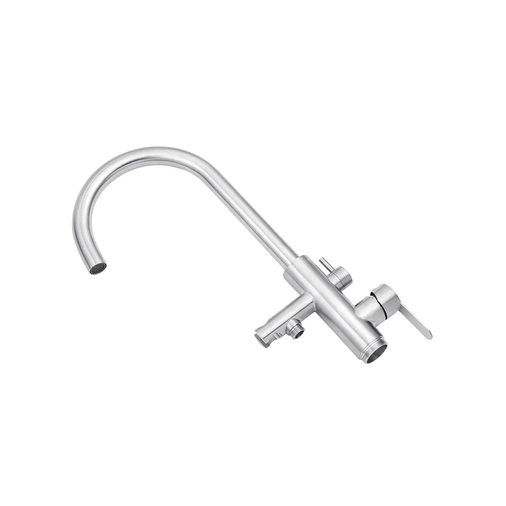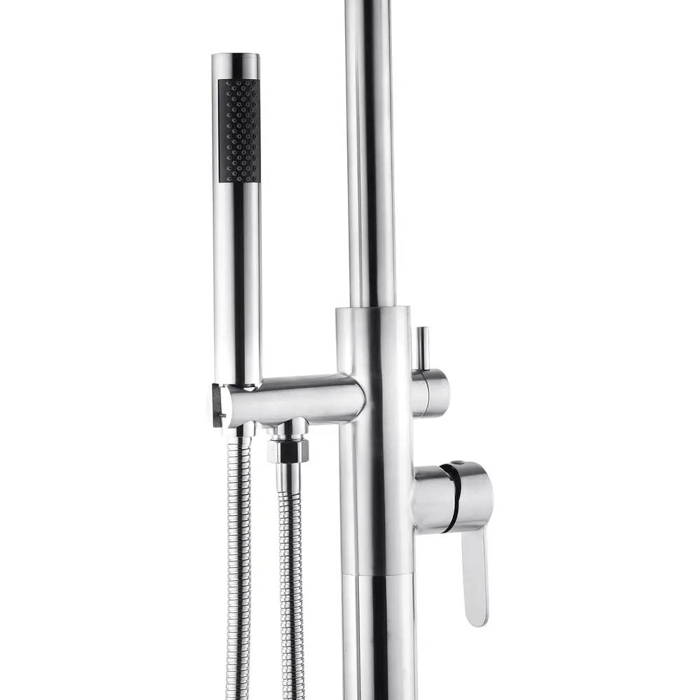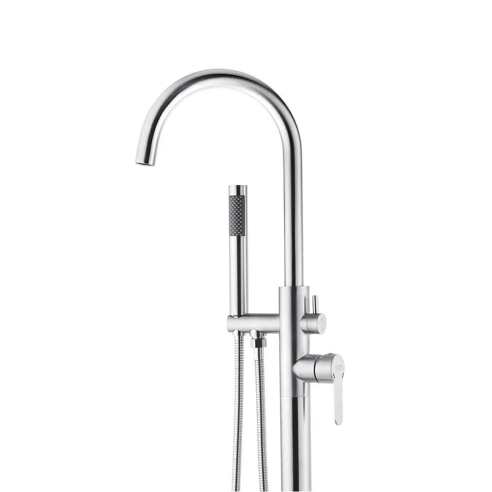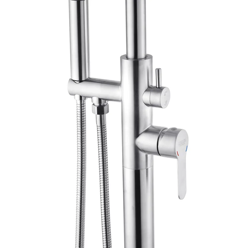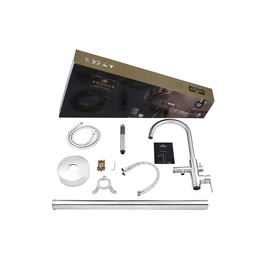 Змішувач для ванни, який стоїть окремо Kroner KRP Edelstahl Klassisch-ESG077 створений з урахуванням зовнішнього вигляду та функціональності, є альтернативою класичним змішувачам для ванної кімнати. Виготовлений із харчової нержавіючої сталі SUS 304, що забезпечує довговічність та безпечність в експлуатації виробу. Змішувач оснащений керамічним картриджем діаметром 35 мм, що забезпечує плавне регулювання температури та напору за допомогою важеля. Оснащений перемикачем ванна/душ, відведенням для приєднання душового шланга діаметром 1/2". Монтується на один отвір за допомогою гнучких підводок підключенням 1/2".