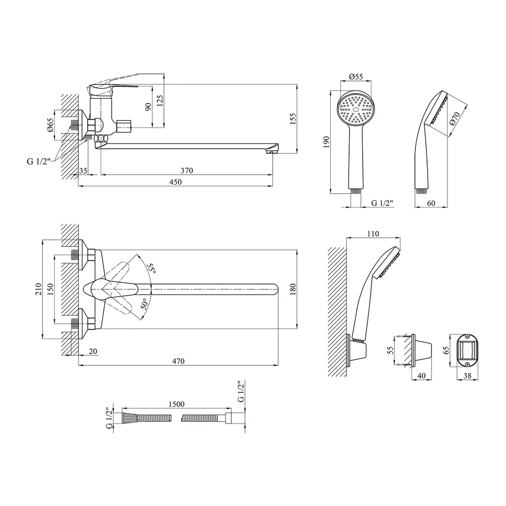 Змішувач, лійка для ручного душу, душовий шланг, кронштейн для ручного душу, кріплення, інструкція.