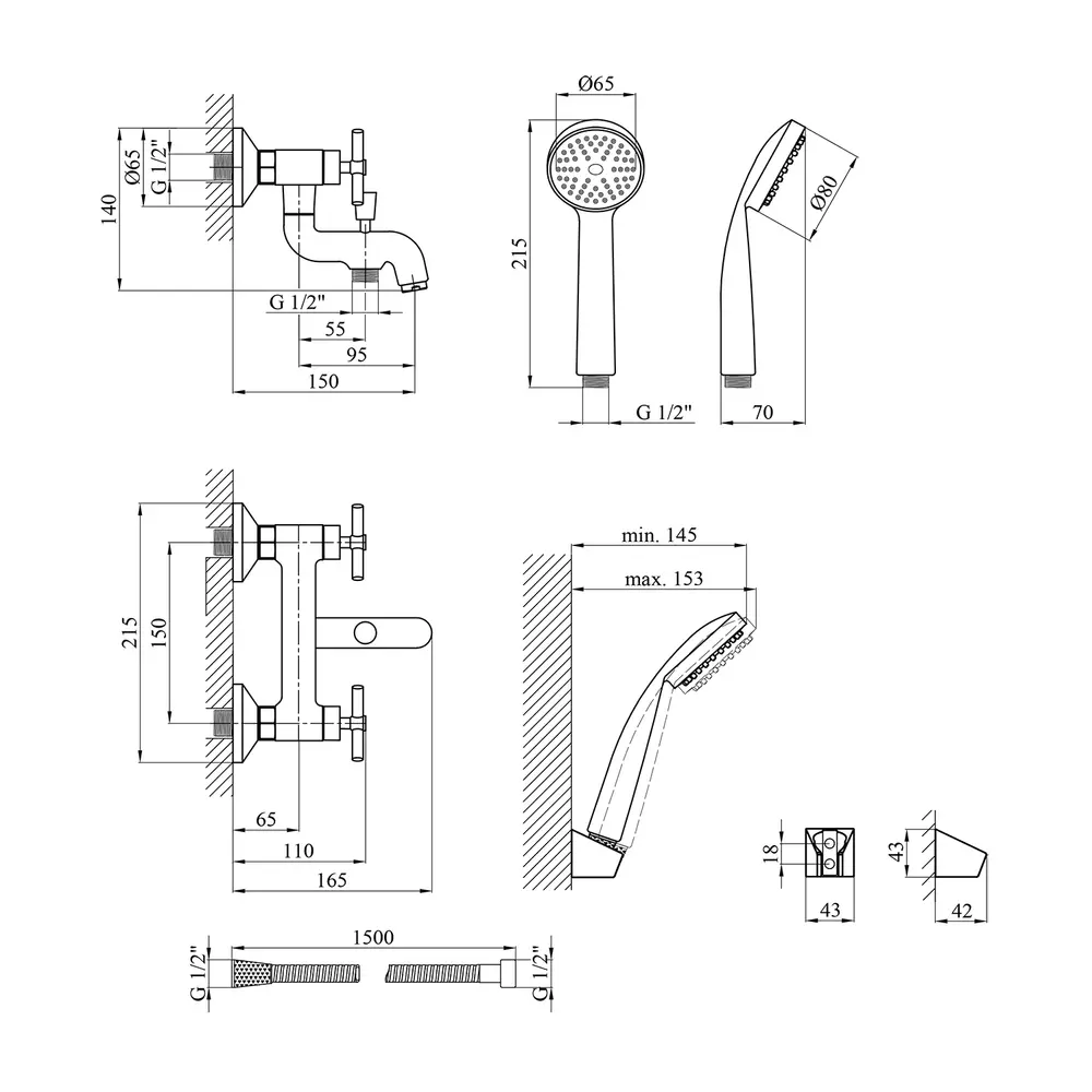 Змішувач, лійка для ручного душу, душовий шланг, кронштейн для ручного душу, кріплення, інструкція.