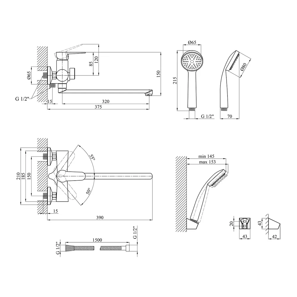 Змішувач, лійка для ручного душу, душовий шланг, тримач для ручного душу, кріплення, інструкція.
