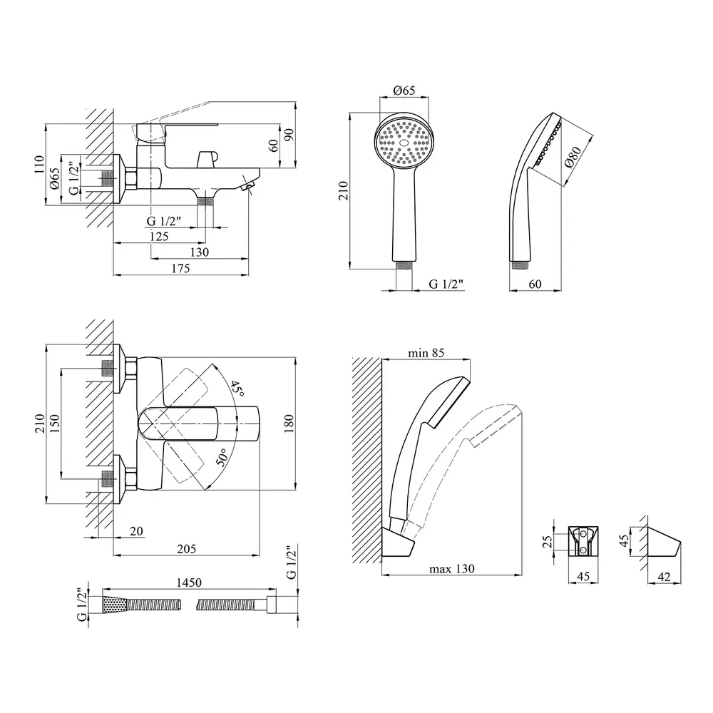Змішувач, лійка для ручного душу, душовий шланг, кронштейн для ручного душу, кріплення, інструкція.